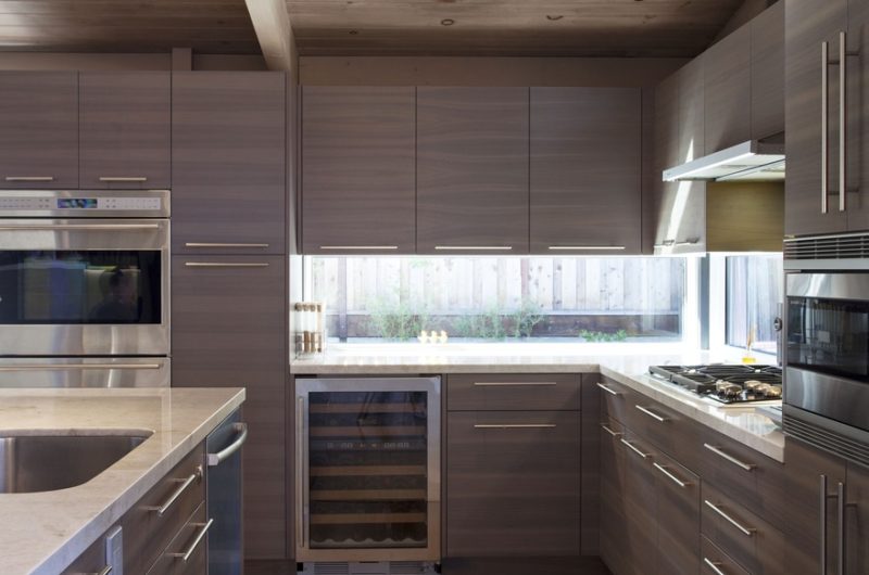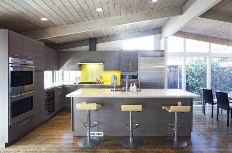 The objective was to update and illuminate what was once a confined and segmented 1960s Brown and Kaufman residence. Finished in two stages, numerous interior walls were initially taken down to enhance the living area, increase natural light, and improve the overall circulation. The previously dim kitchen, which was separated by a partition wall, is now significantly brighter with new windows that allow more light to enter. The redesigned kitchen has been adjusted to connect directly with the great room, enabling the entire family to interact and gather in the spacious environment.