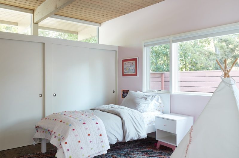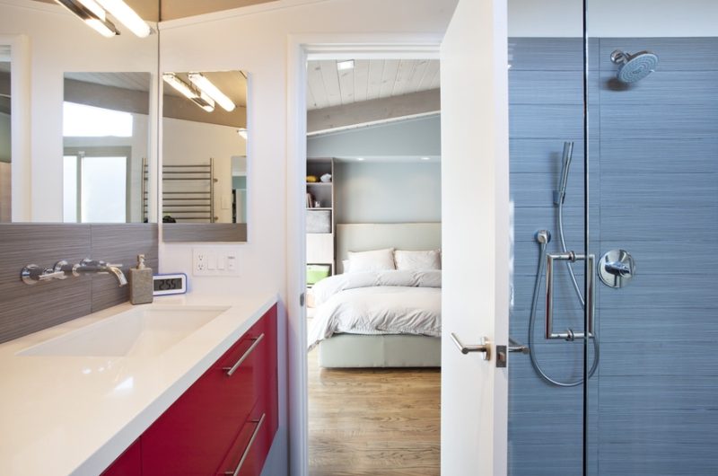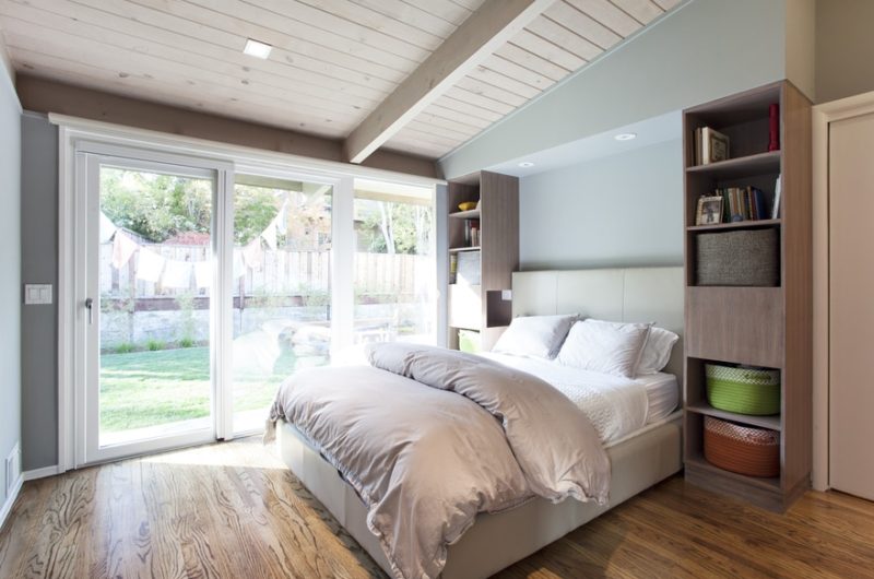 The clients desired a master walk-in closet to replace their insufficient 1960s closet, prompting a slight expansion of the master suite into the living room. The reimagined area allowed for an extra desk/work space as well as a more practical laundry room. Although the overall size of the living room was reduced, the area feels considerably larger and brighter due to the removal of interior walls and the addition of larger glass openings that connect to the outdoors.
