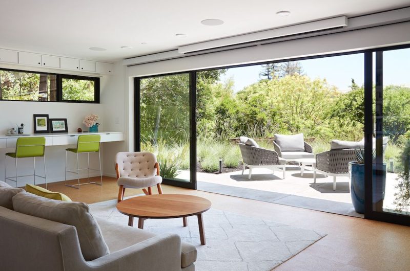 The existing lower level, originally designed by Lee as a utilitarian space, functioned as a wet pool room with a drain in the center of the floor, along with a bathroom, laundry, and storage areas. With no need for a pool room, Klopf transformed the area into a much more comfortable and functional living space, featuring a new family room and guest suite. The new areas enjoy convenient access to a new outdoor patio through floor-to-ceiling, full-width glass sliders.