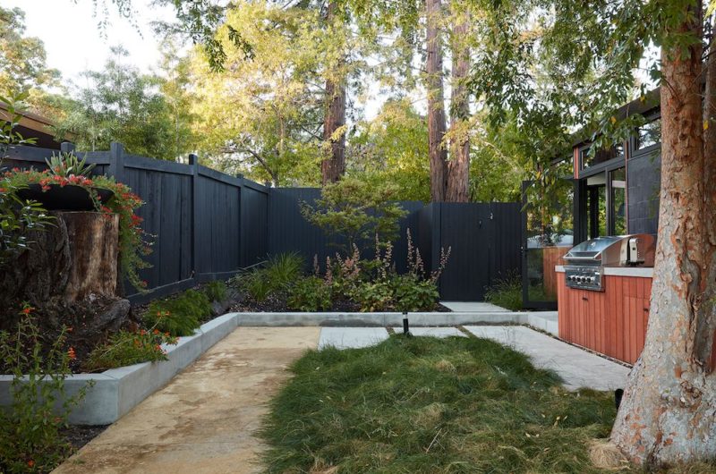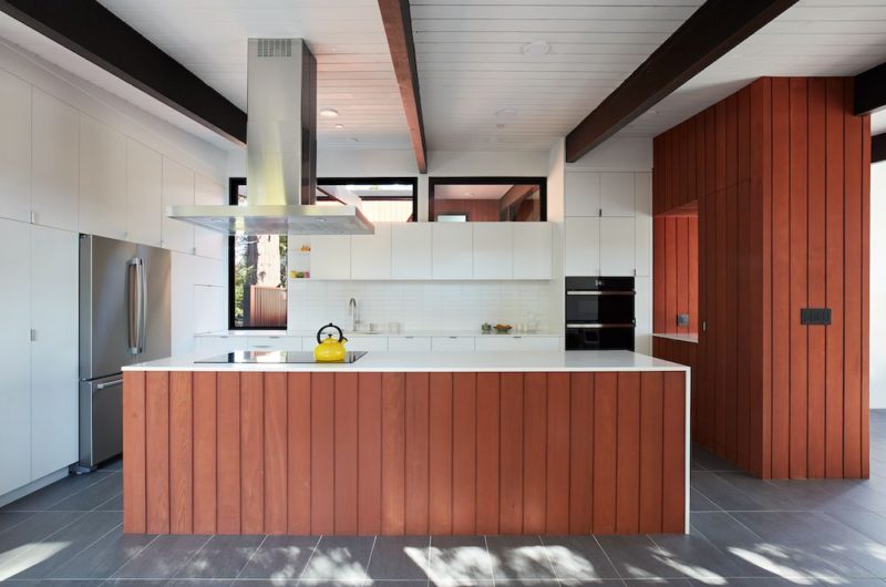 Inside, the original wood-burning Malm fireplace was beautifully restored, and a gas burner was added to meet California‘s stringent air quality standards. It now sits in front of a wall of Heath accent tiles, replacing a dated red brick wall. A new taller window allows more light and views into the refreshed interior living room. The original glass doors opposite the fireplace were replaced with larger sliders that, when fully opened, create a seamless transition to the new outdoor living area, making the two spaces feel like one cohesive area. The original utilitarian kitchen was unnecessarily tucked into the far back corner and closed off from the living room, prompting the clients to request Klopf to open it up and extend the kitchen forward for a more connected feel. Today, the significantly larger kitchen is linked to the living area, where a short wall with a cutout provides a visual connection to the kitchen and a convenient pass-through counter for serving guests. A new breakfast nook was also introduced to create an additional gathering spot for casual meals. Just outside, a new built-in outdoor grill and prep area extends the kitchen outdoors, connecting to a new dining area nestled among the trees, taking advantage of the views in the backyard.