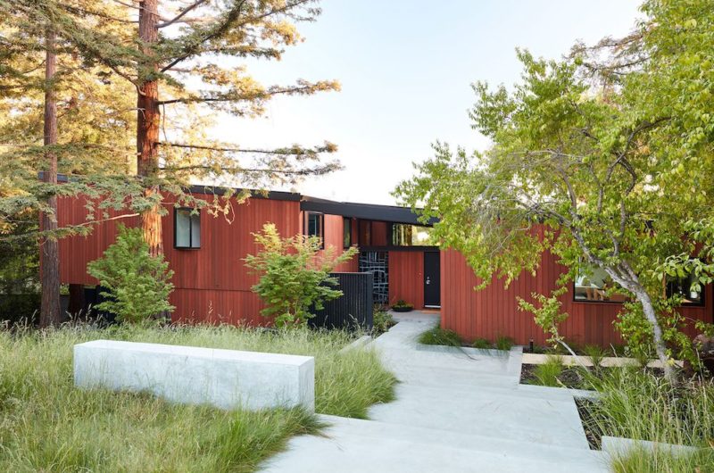 To preserve a historical connection to the original designs, the exterior siding was replicated on all exterior walls, a full-height stained glass window at the front entryway was restored, and an interior slatted screen element was echoed outside at the exterior entry courtyard and over the new outdoor living area to create a shade trellis. The new house stands proudly and shines against its new landscaping features while honoring and expanding upon the original intent of Roger Lee’s designs, epitomizing the comforts of indoor-outdoor living in Northern California.