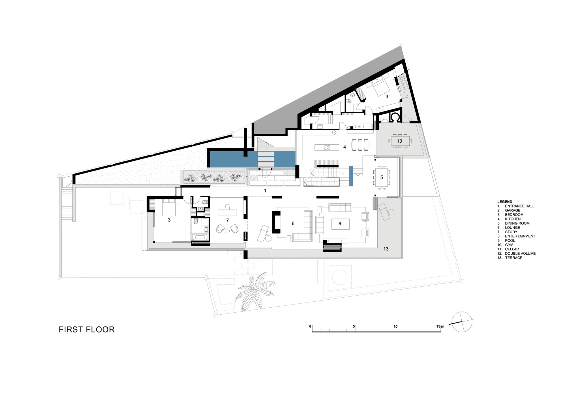 The main living wing of the house includes 2 lounges, a dining room and a kitchen. The ground floor accommodates a large pool entertainment room with a feature sunken lounge, a back-lit onyx bar, a wine cellar, a gym and also a guest room.