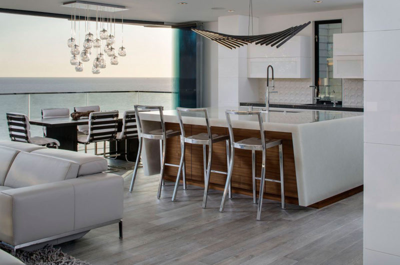 This dreamy beach house in Laguna Beach, California was sketched out by Mark Abel and Myca Loar and offers 3,400 square feet of living space. Its steel frame was designed using a state-of-the-art 3D modeling system, and it includes a 33′ frameless glass door system as well as cantilevered decks with glass railings. The house was built on top of a rocky site that offers breathtaking panoramas of the ocean and of Catalina Island.