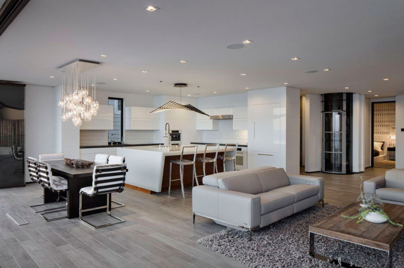 The private living areas consist of six bathrooms and four bedrooms, while the social spaces comprise a media room, a living room, a fully equipped kitchen and a dining area for six. Access between the three levels is achieved via a wooden staircase and a glass elevator. Comfortable and luxurious, the Laguna Beach Home flaunts a modern smart house technology system that allows the user to control a plethora of features such as the security cameras, lighting, heating, irrigation, music and window blinds with the help of an iPad or a smartphone.