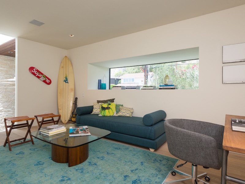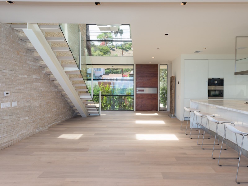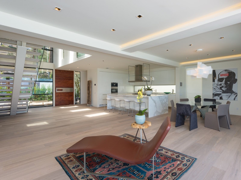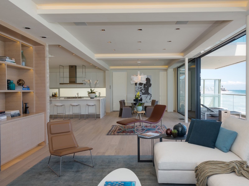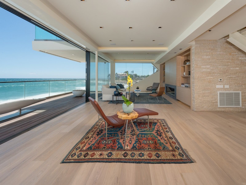 The entryway has a mahogany pivot door that immediately reveals breathtaking ocean panoramas. There’s also a staircase with glass railings and “floating” steps that connects the two levels. Glass was used extensively for some walls that help fade the limits between the indoors and the outdoors thus creating a wonderful, welcoming ambiance. The kitchen boasts a 10-foot island clad in Calacatta stone as well as Miele and Sub-Zero appliances.