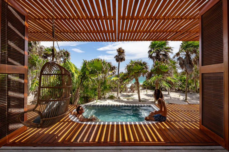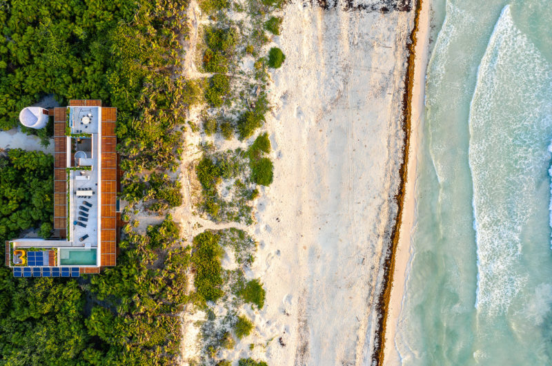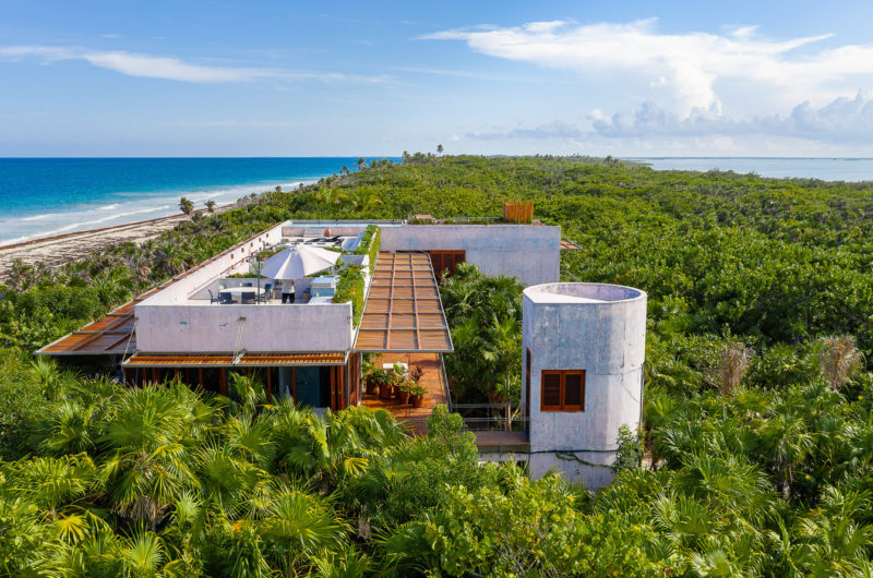 Bautista house, designed by Productora Architects sits right at the shore of Riviera Maya, near Tulum, in Quintana Roo, Mexico. It is a contemporary designed house with sustainable features like solar energy panels and wind energy modules to power electricity. The house rests on cross-shaped columns over the dune that separates the property. This is especially executed to maximize the views offered by the sea.