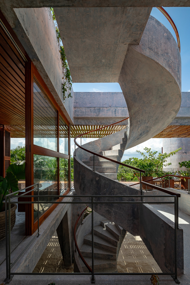 The house stretches to three floors interconnected by a helical staircase that steals the entire show! Moreover, the ground floor below the house has an open garden and lush greenery, the intermediate floor contains all the interior spaces and the large roof terrace of the third floor has access to the pool and outdoor dining.