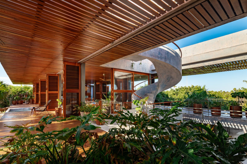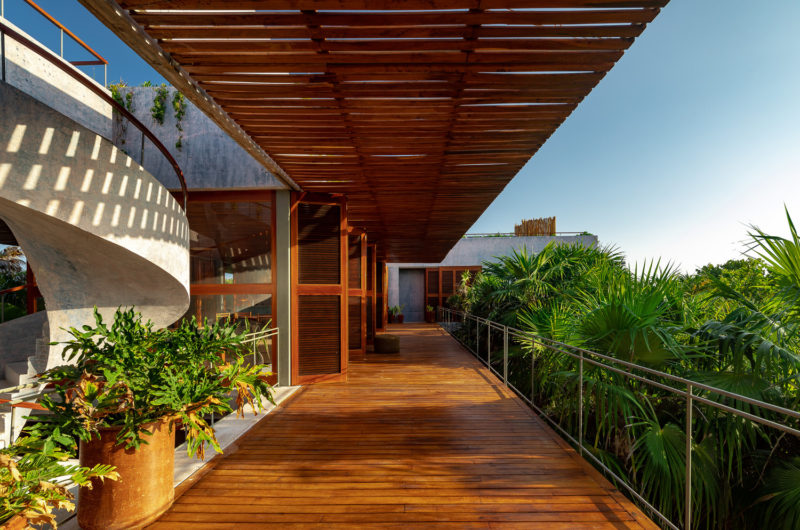 The longitudinal open terrace coverings have a folding mechanism that protects the house during hurricanes by raising and lowering these heavy elements against the façade. And, the large terraces provide good cross ventilation to the interior while also protecting it from the harsh sun rays.