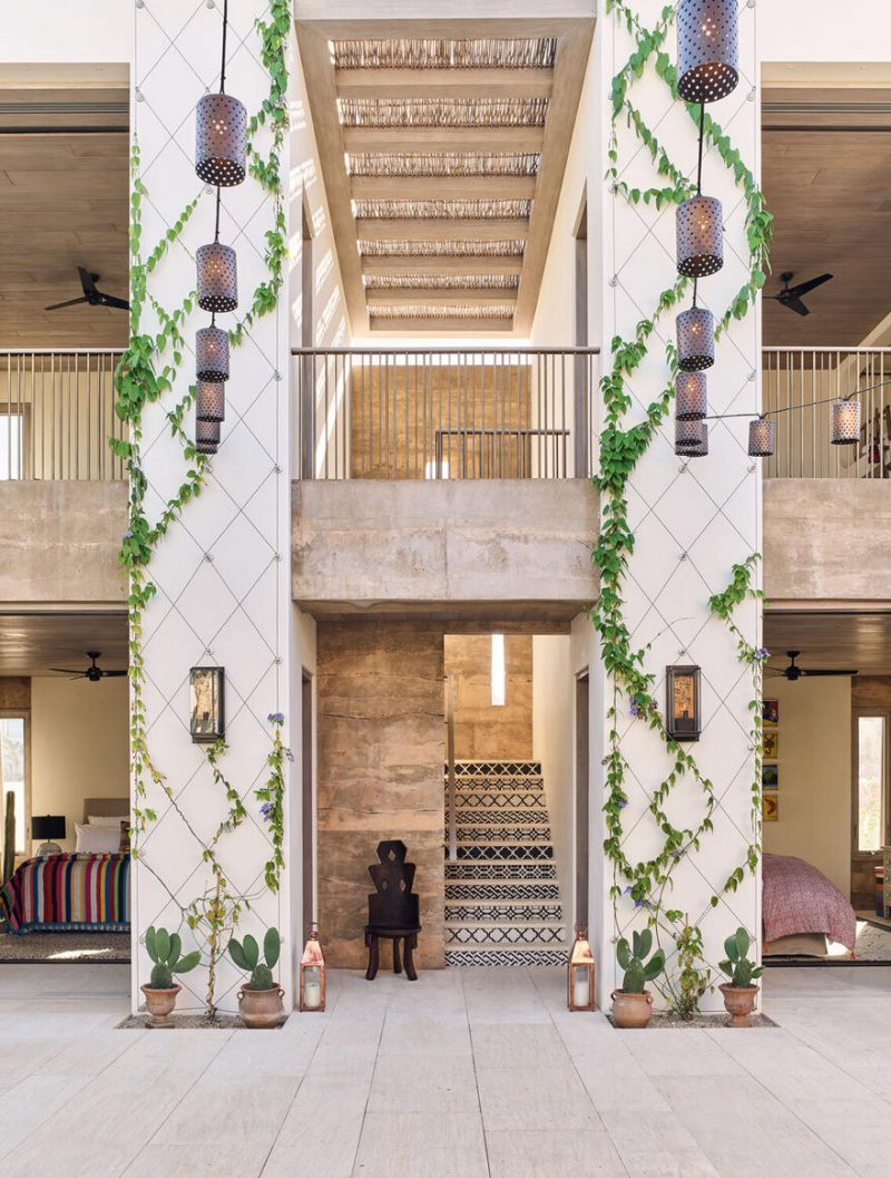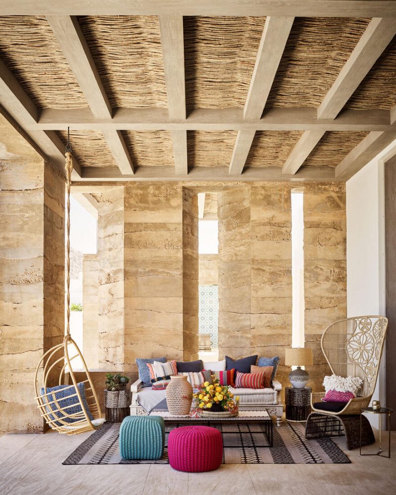 The architectural features in the interiors are neutral and act as a canvas for bright home décor pieces. The contemporary furniture takes a cultural context and gives traditional Mexican feel. Poppy colors and organic printed textiles dominate the character play in the rooms. Whereas stone walls and flooring provides soothing effects.