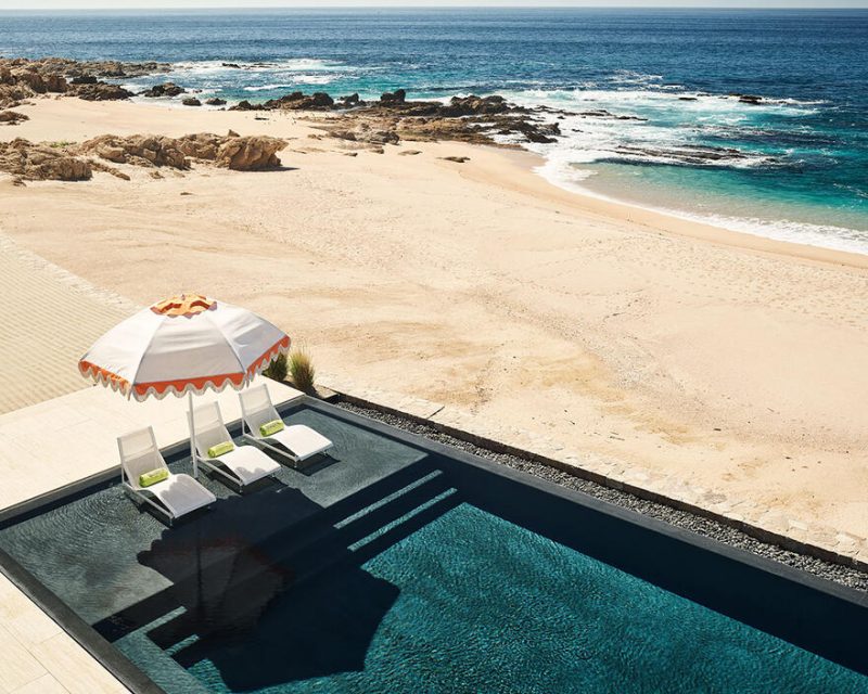 On the other side of the house, an outdoor pool overlooks the mesmerizing Pacific Ocean. The pool stretches to the beach, thus, making it look like a part of the ocean itself. A cool set of sunbathing chairs sits near the edge of the pool and serves as an ideal space to enjoy a glass of Margarita.