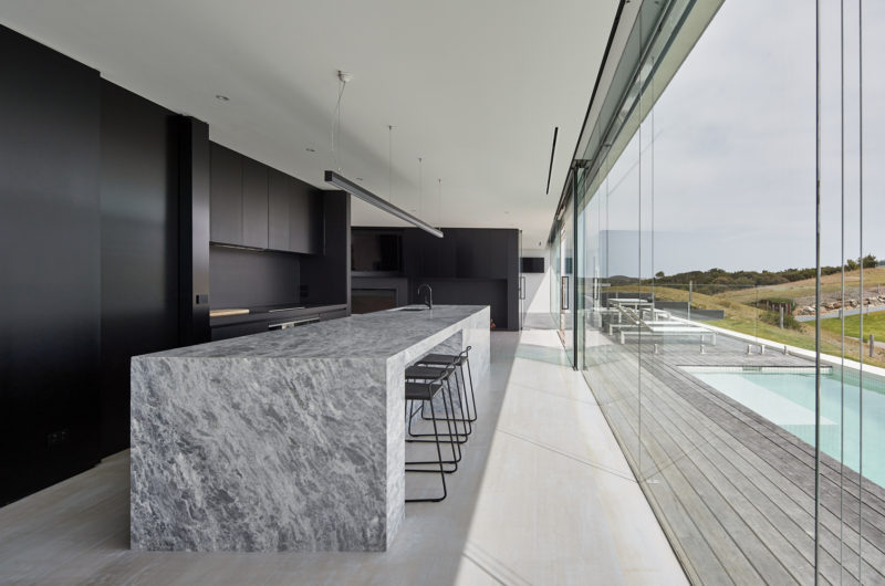 The kitchen features a statement 5-metre-long textured limestone island bench. Light timber flooring finished with dark joinery covers the entire space. Dark wall hung shelves complement the space. A frameless glass wall opens up to the swimming pool and floods the kitchen with natural sunlight.