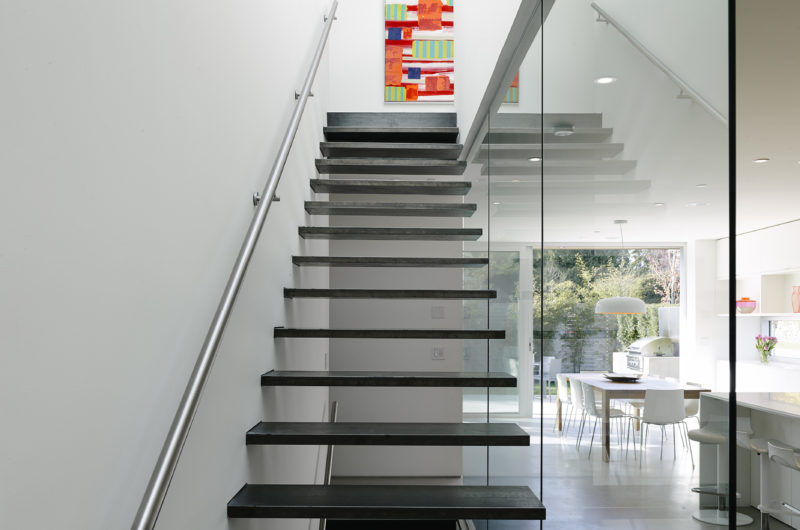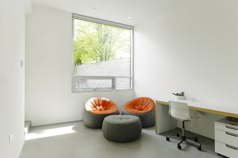 Because the house is turned sideways on the lot, the rear of the structure is located on the lot’s side. Large windows give the home an open dollhouse effect on the ground and upper floors. The 3,700 square feet of living space is now divided between the basement, and ground and upper floors, which is a far cry from the one-storey, 1,400-square-foot home the family of four used to occupy.