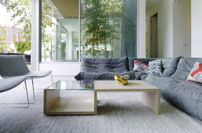 HOW DO YOU BRING THE OUTDOORS IN? If you’re designer Nigel Parish of Splyce Design, you wrap a house around a stand of bamboo on three sides, creating a contemporary adaptation of the classic courtyard garden. The bamboo garden is a standout feature in a two-storey new home in the Edgemont neigbourhood that Parish designed. Walled off by glass on two sides and open to the elements at one end, the garden juts halfway into the living space, separating the living room from the kitchen-dining area. Floor-to-ceiling windows allow the homeowners to feel as if the garden is part of their interior decor and to look through its foliage to the rooms beyond.