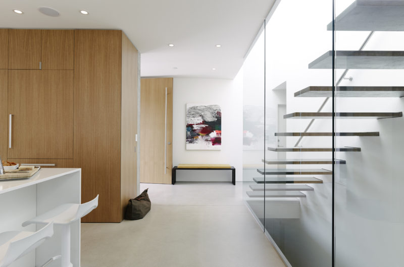 Parish says he’s happy with the circulation in the home, in which there are no dead ends. “You can literally do laps around the home.” He says the house was designed around his cli – ents’ needs. “I won’t go so far as to say that form follows function,” he says, but adds he’s satisfied with the unique look of the home that sits side – ways on this lot, has an open look at the back and boasts a garden that appears to be indoors.