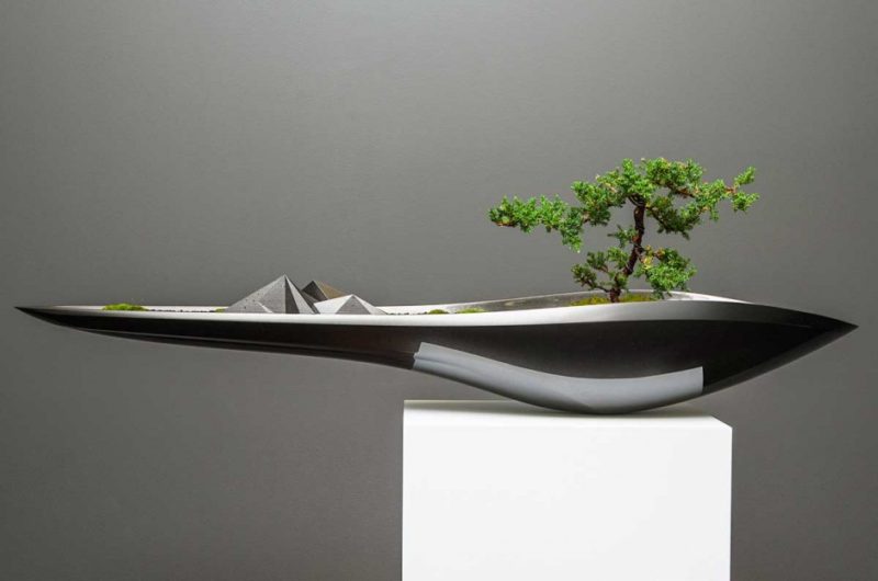 The piece gives the impression of an accelerating form that effortlessly floats to house a bonsai tree, evoking a perfect balance of dynamic harmony.