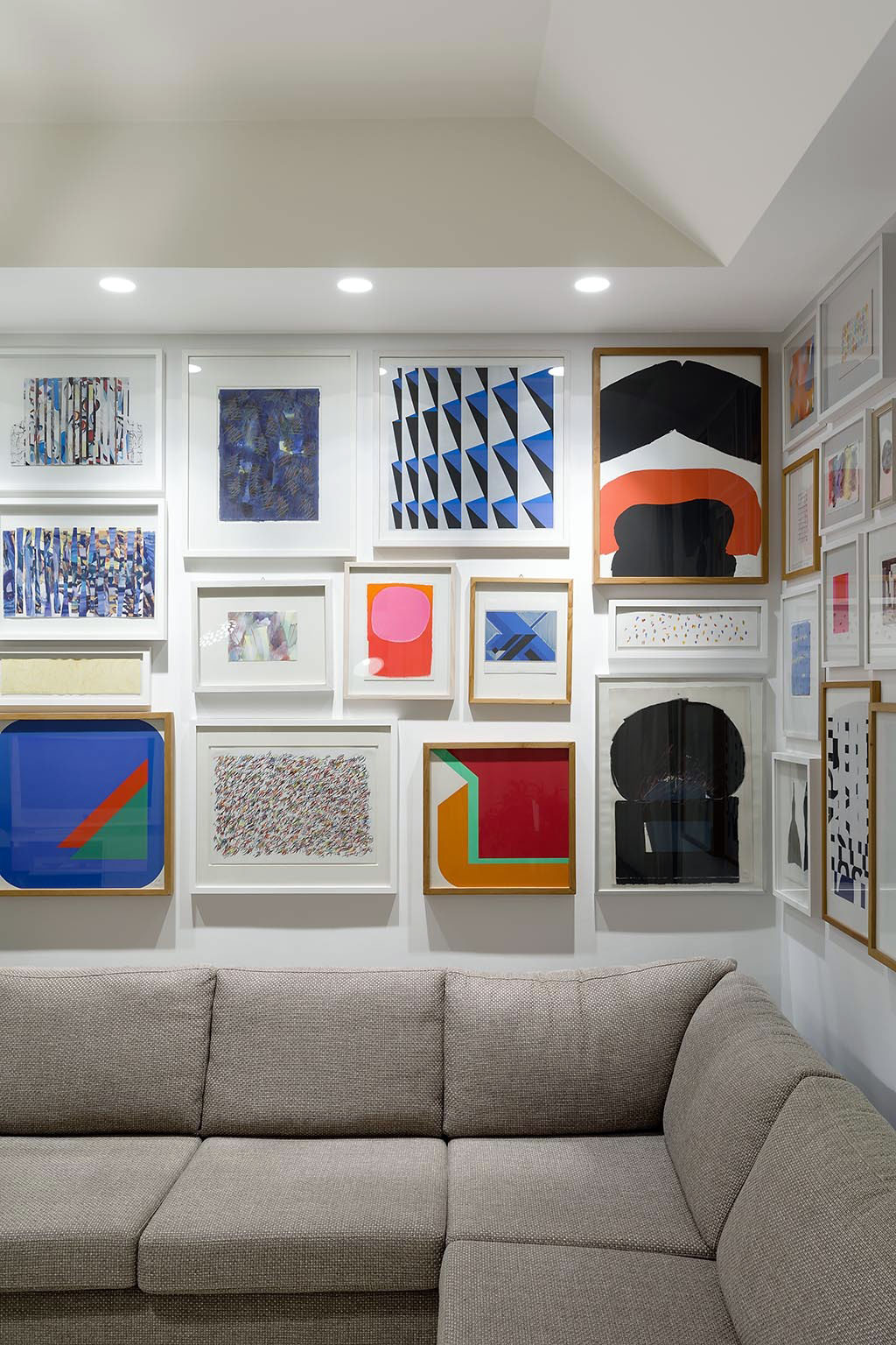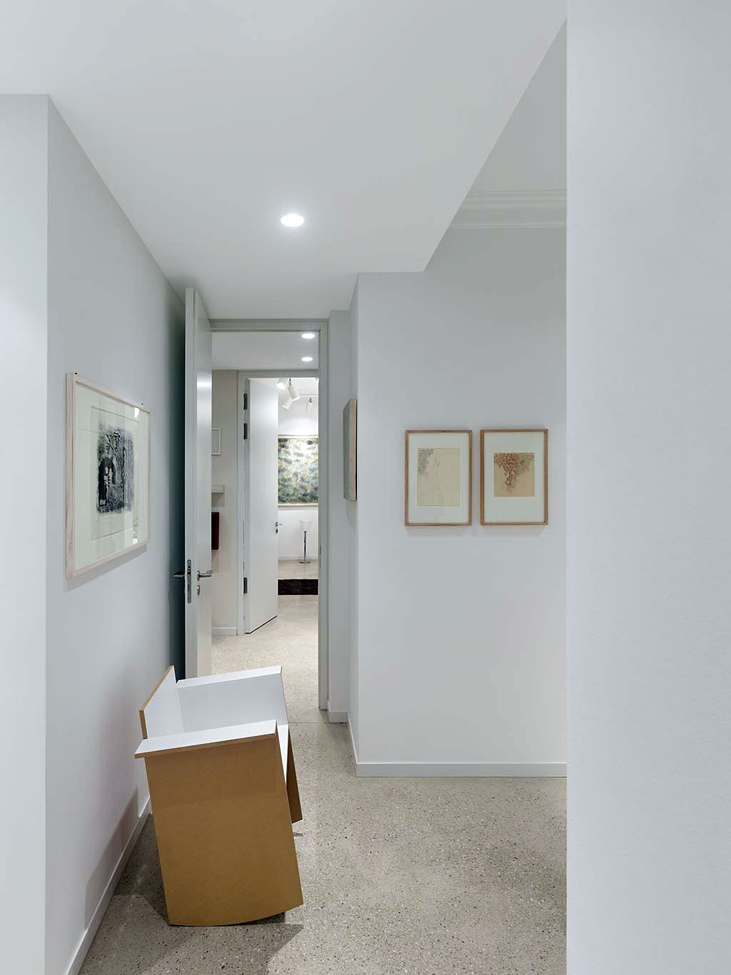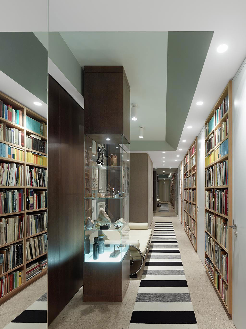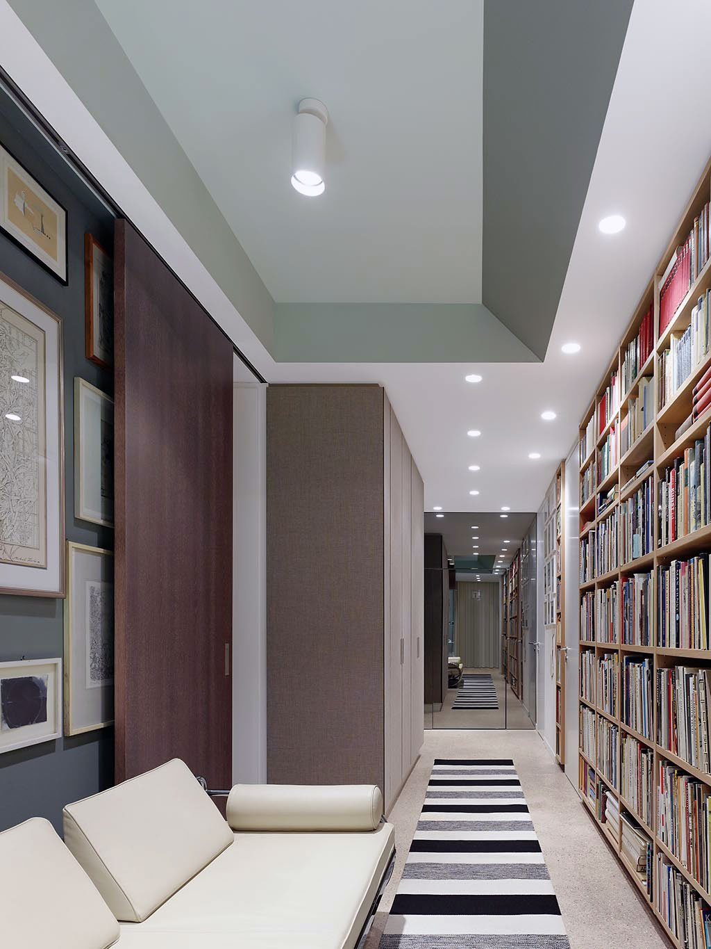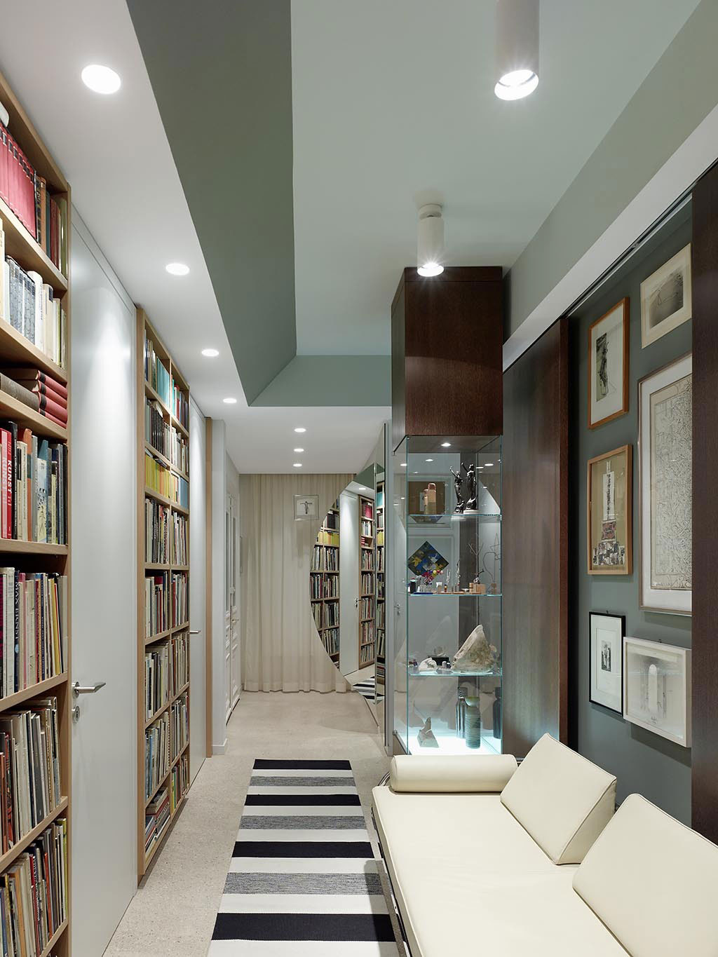 Both, the gallery and the library are set along the long corridor. The living and the dining area are concealed by beautiful, tall, dark wood sliding doors.