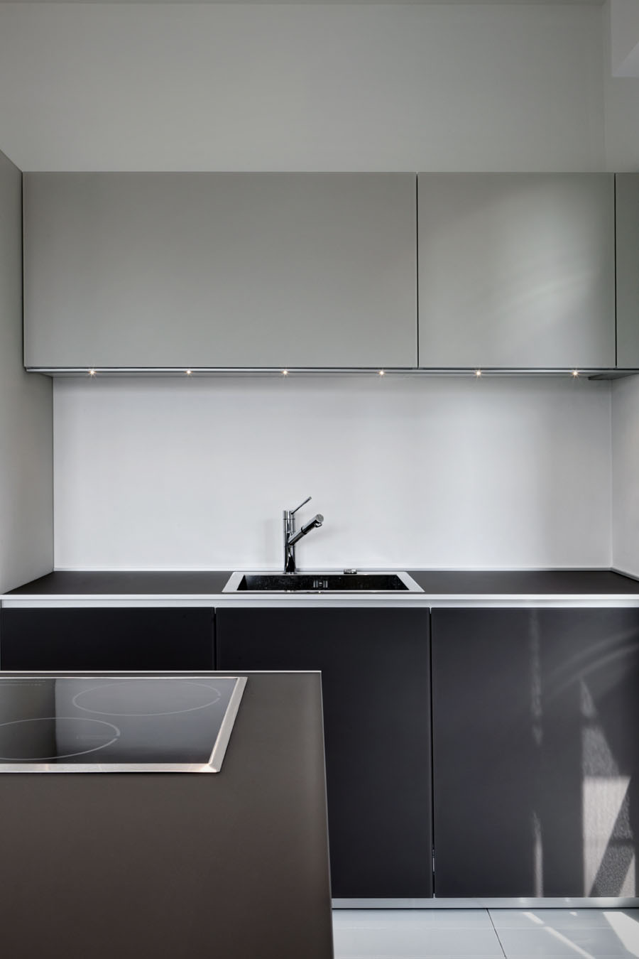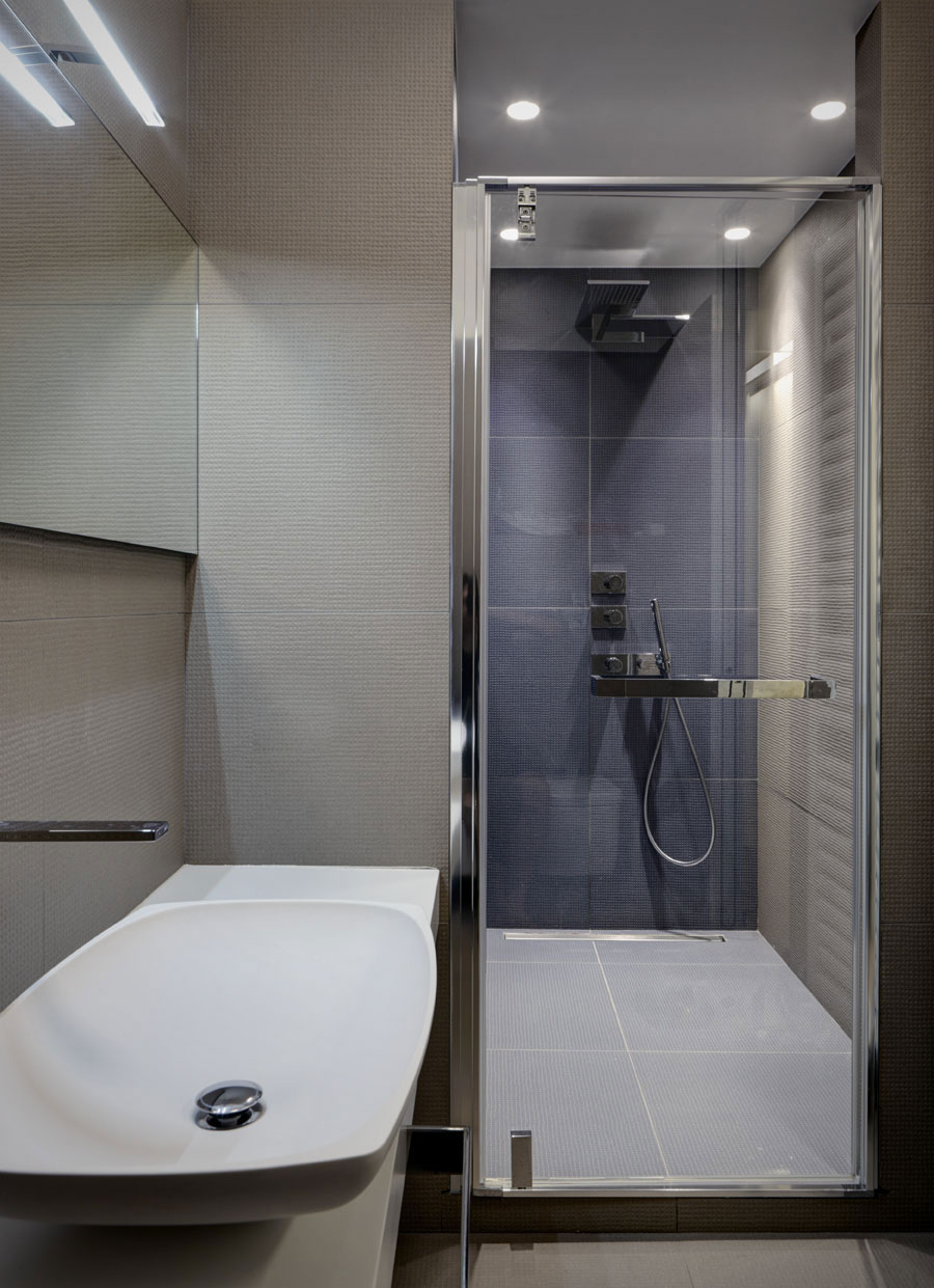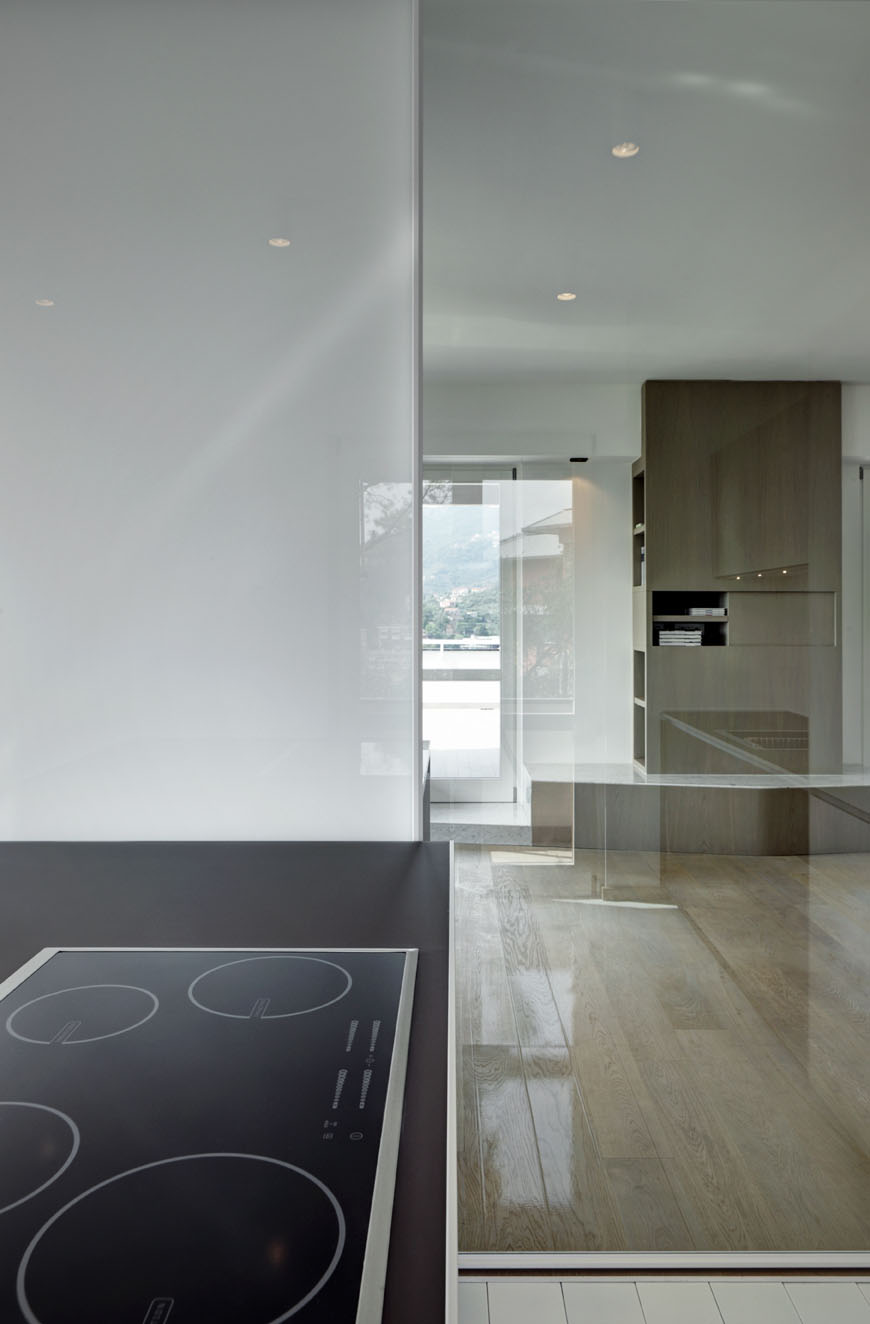 The kitchen also received some attention, and it now boasts fine materials and glazed surfaces. This space is separated from the living are by glass sliding doors, meaning that the two areas can easily communicate when the doors are opened. Transition from one room of the house to another is natural and easy, a characteristic that we appreciate in any contemporary home.