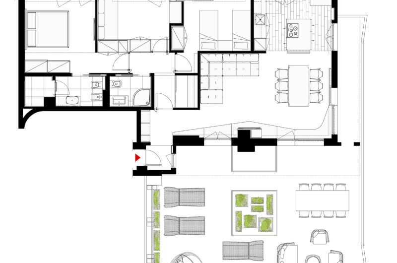 It is situated above a block of flats from the 1960s, and the main purpose of the renovation was to define the border between the living room and the great terrace, while also ensuring an easy communication between the two.