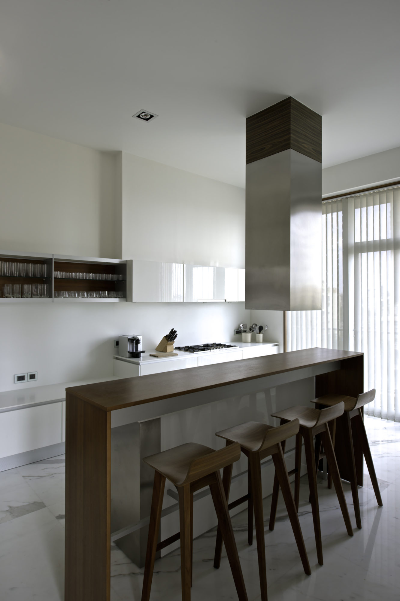 The staircase was made out of wood, and it flaunts a unique, undulating layout that can be admired from almost every public area. The bedrooms are tastefully decorated and furnished with high quality pieces that were obtained from a fair in Milan. The place that brings all of the family members together is the kitchen, and so it boasts a welcoming and warm atmosphere that encourages socialization and relaxation.
