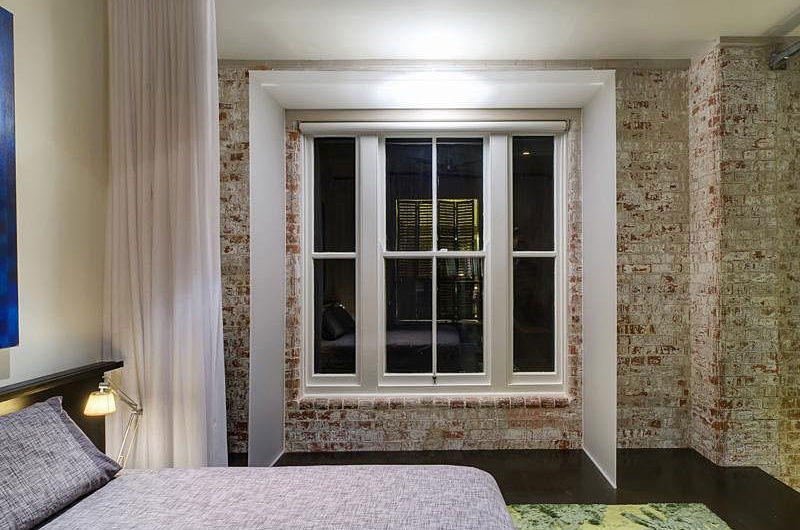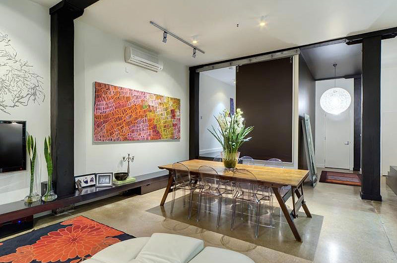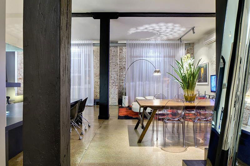 The generous floor plan seamlessly integrates the living, dining and kitchen areas in one airy and sophisticated space. The interiors flaunt century-old polished concrete floors and historic brick walls that contrast beautifully with the sleek contemporary finishes of the house.
