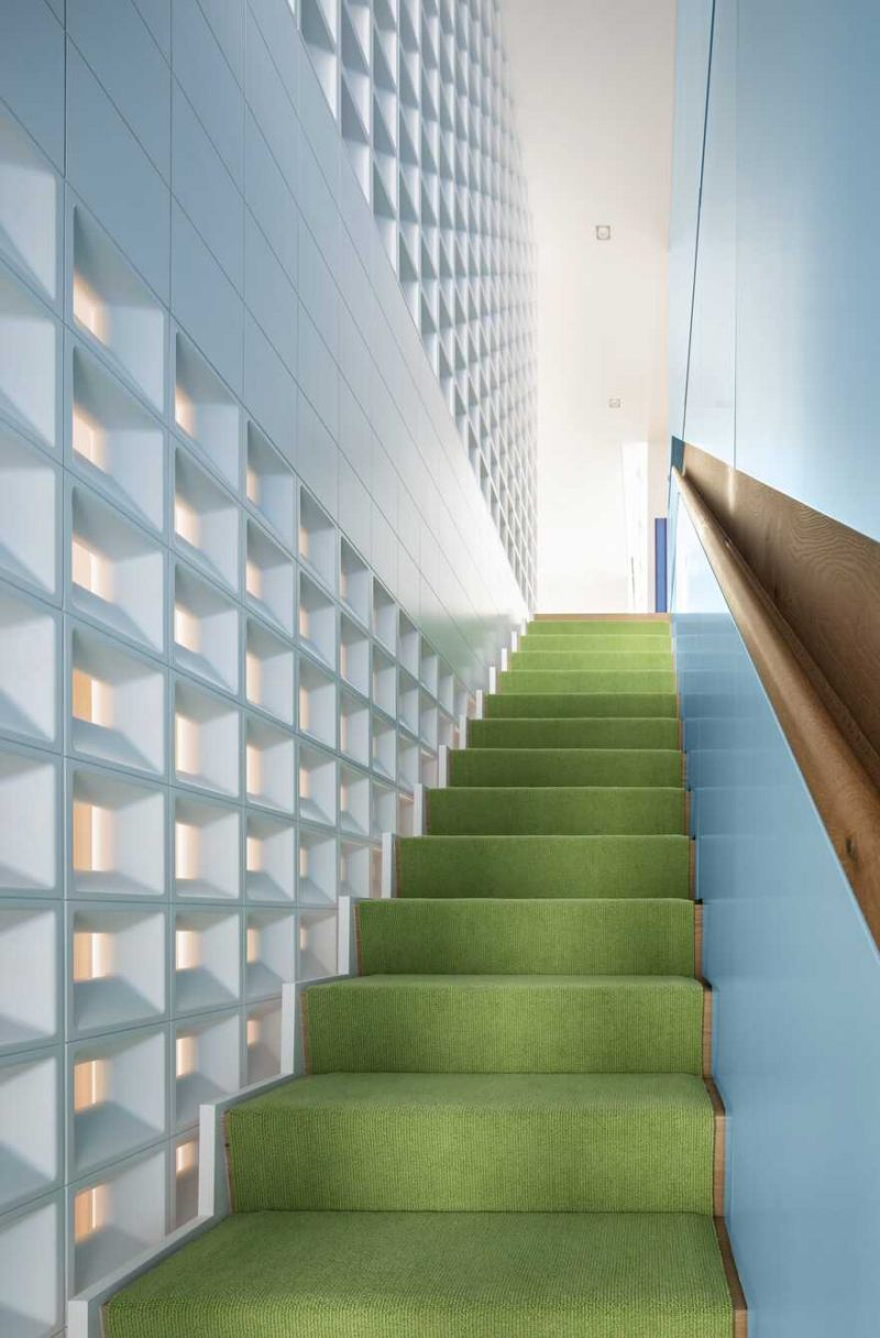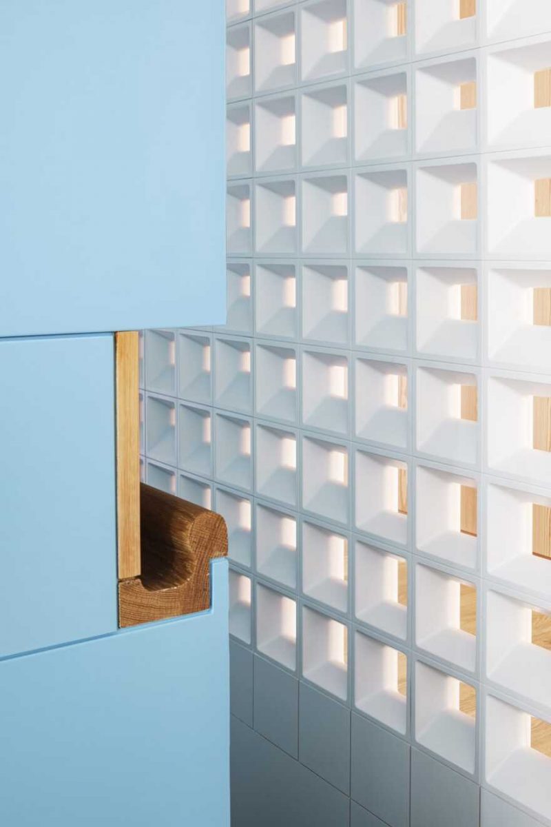 Considering the existing structure of the apartments with the stairs as the only existing link between them, a unique approach to replicate a tree with branches is decided upon. A three-story wall of wooden blocks with perforated sections is installed. These sections emit shadowed light imitating luminosity escaping from a leafy canopy. Another element of continuity is added to the triplex in the form of a blue wall that becomes prominent as you go up in the triplex. It appears as a small section on the lowest floor and gradually ascends to frame the master bedroom and dressing room on the top floor.