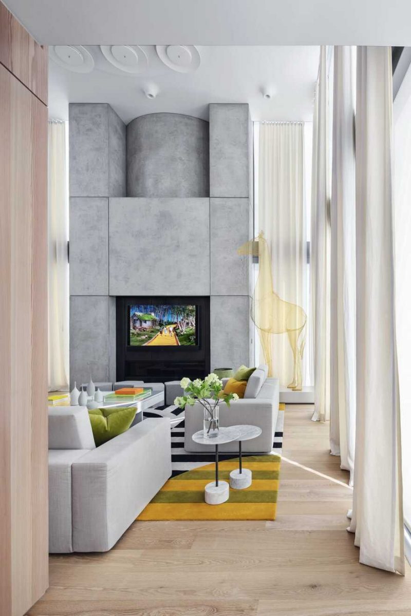 A warm larch wood with a vein-like surface design is utilised to make the fire staircase and elevators look like an extension of the apartment. The use of warm veneer is extended to make additional functional areas. These areas are given a neutral grey lacquer to build on the idea of these elements replicating a tree and its bark. This skin mimicking a bark is the core element of the north wall in the living room. Whereas, the south wall of the living room is decorated with a concrete sculptural monolith consisting of a fireplace and a unique pulley system to manually operate the screen.