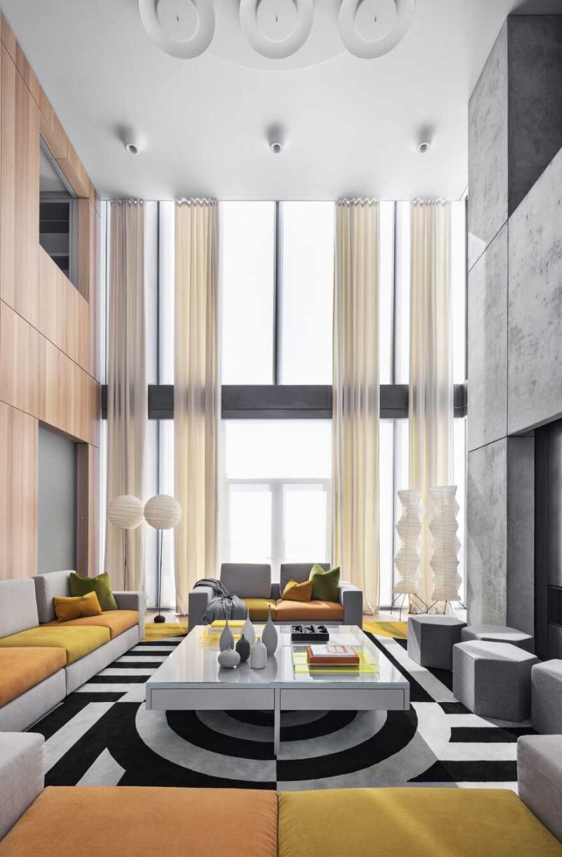 The double-height living room in Manhattan’s Triplex Apartment