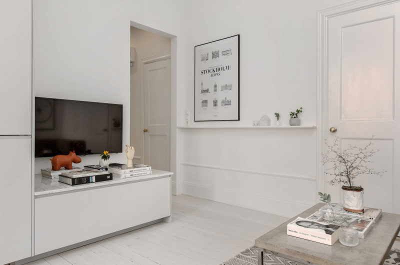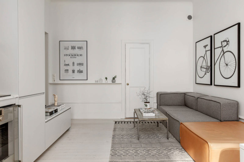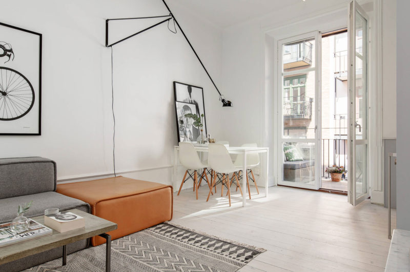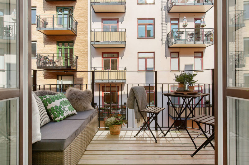 Offering a modest living area of 387.5 square feet, this modern and comfortable apartment can be found on a street called Rörstrandsgatan in Vasastan, Stockholm, Sweden. The residence impresses with an elegant, minimalistic design that gives off a sense of comfort and serenity. It features a small balcony with small chairs that can be used to take in the neighborhood views while savoring a delicious cup of tea or coffee.
