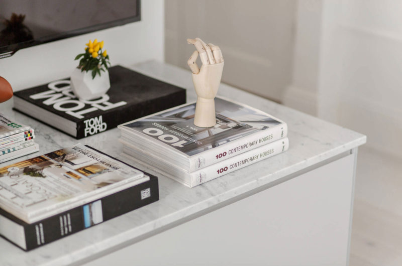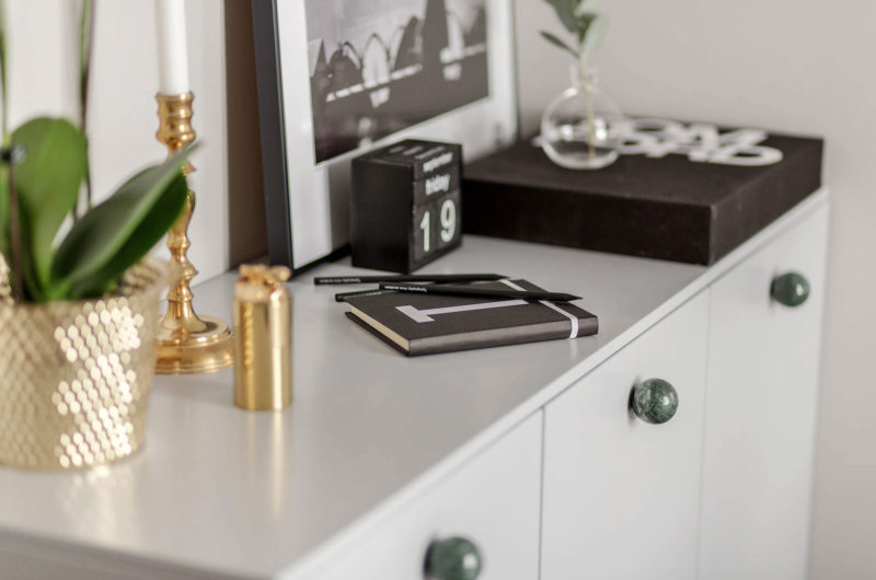 Inside, the walls, doors and floors are crisp white, as are some of the furniture pieces such as the dining table, chairs or cabinets. The décor elements include paintings that depict images in black and white, but natural plants can also be found throughout the apartment for a touch of naturalness and color.