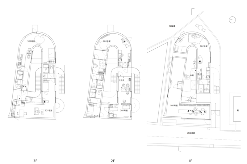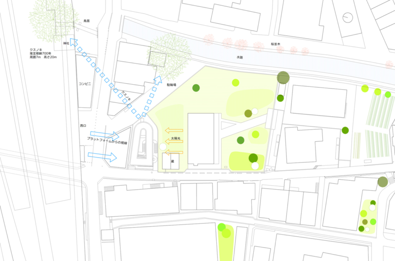 Three elements were connected smoothly as it follows: the front road of the site facing the 1st floor office, the elevated platform to north and the sun to south.