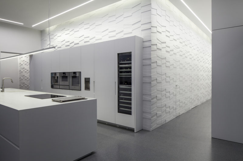 In an attempt to unite the two sections and transform the concrete nucleus into a connection between the spaces, the architect chose to cover it with dynamic, developing geometrically shaped textures especially designed for the project. The cladding is three dimensional and made from large sheets of white painted aluminum hung on the nucleus’s ceiling. The apartment’s spaces were designed to create a meditative atmosphere with monochromatic sheets all based on the color white. Through a play on light and shadow and textures, multiple layers of white, almost ”colorful” in their richness are created, displaying many varied and deep hues of white.