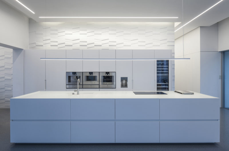 The apartments light fittings complete the considered and thrifty look of the apartment’s lines. Long, thin strips of light emphasize the linier axis along the length of the corridor and ceiling fixtures that appear as works of origami compliment the triangular, three dimensional walls. Hidden lighting is installed along the walls that emphasizes the surfaces of the triangles and creates, from the central wall a wall that is also a sculpture, dramatic and dynamic. Thus the apartment’s various layers of white create a surprising depth and geometrical, original and obvious forms against a pure backdrop and a reduction in the apartment’s colors. The designer’s choice of such a monastic and silent environment provide the perfect backdrop that enables the space to encompass the entire city seen on the horizon.