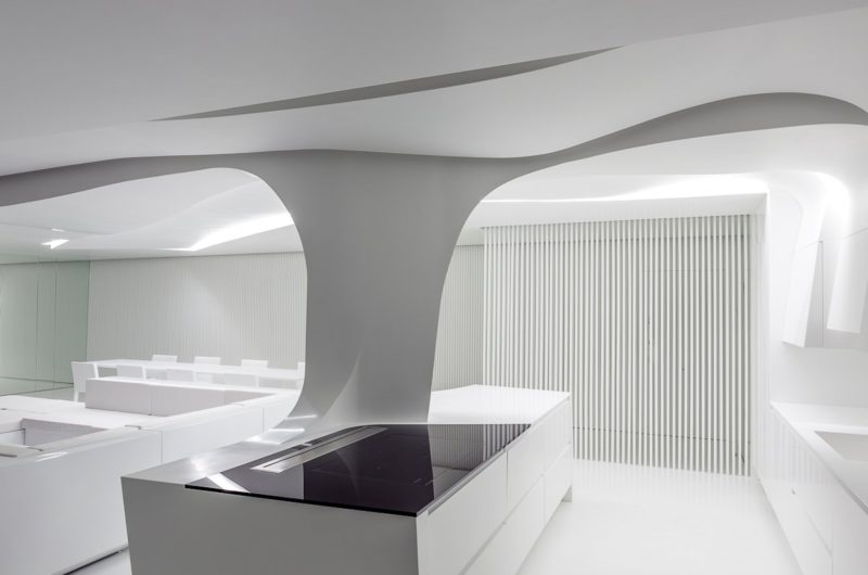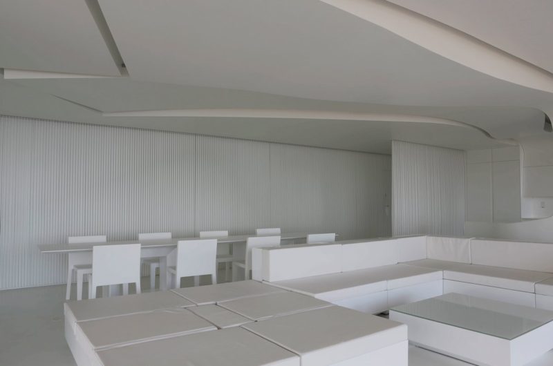 Featuring exceptional views of the sea, the penthouse includes a series of undulating shapes that mimic the waves and their natural motion. The ceiling, for example, boasts a curvaceous design and features a white glow complemented by LED lighting arrangements. These LEDs change color according to the owner’s preference in order to create an exceptional atmosphere. Everything from the closets and dressings to the interior doors boast a white lacquer finish that matches perfectly with the overall pure theme of the abode.