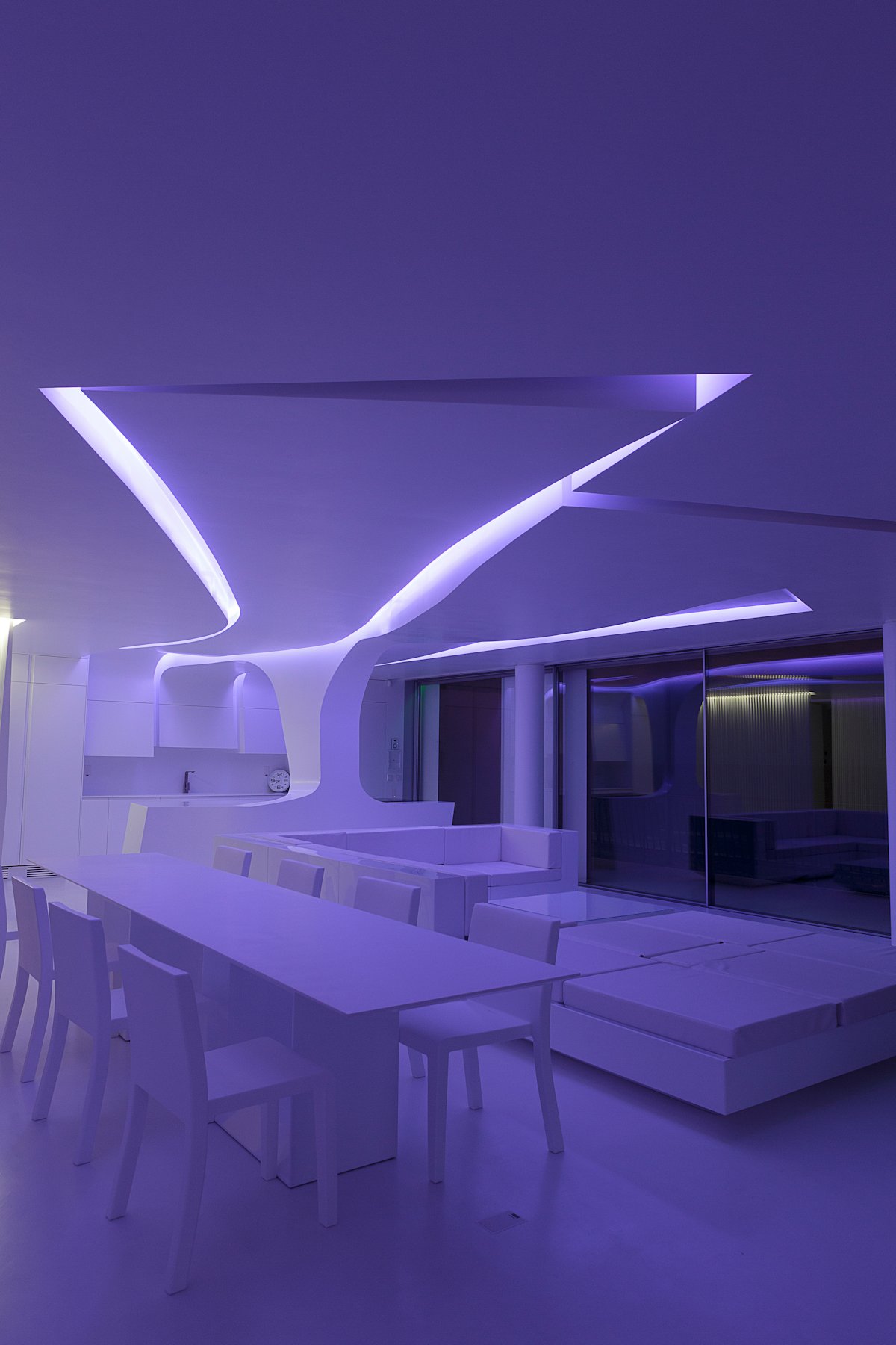 We have designed a ceiling whose curves are resolved in white glow Krion by Porcelanosa. This ceiling goes through walls also, and has indirect LED lighting that changes colour to create different atmospheres and feelings.