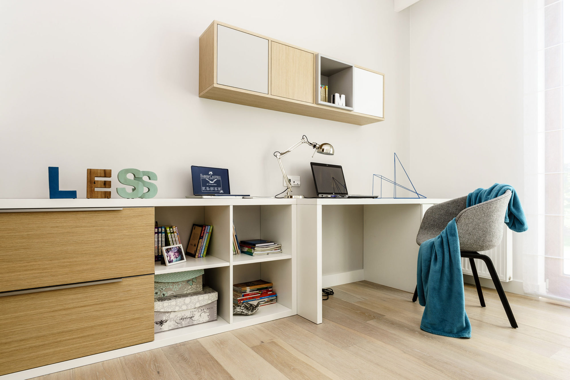 As far as storage is concerned, many of the cabinets and lockers are hidden away behind tall panels or doors in order to maintain a harmonious, welcoming atmosphere throughout the residence.