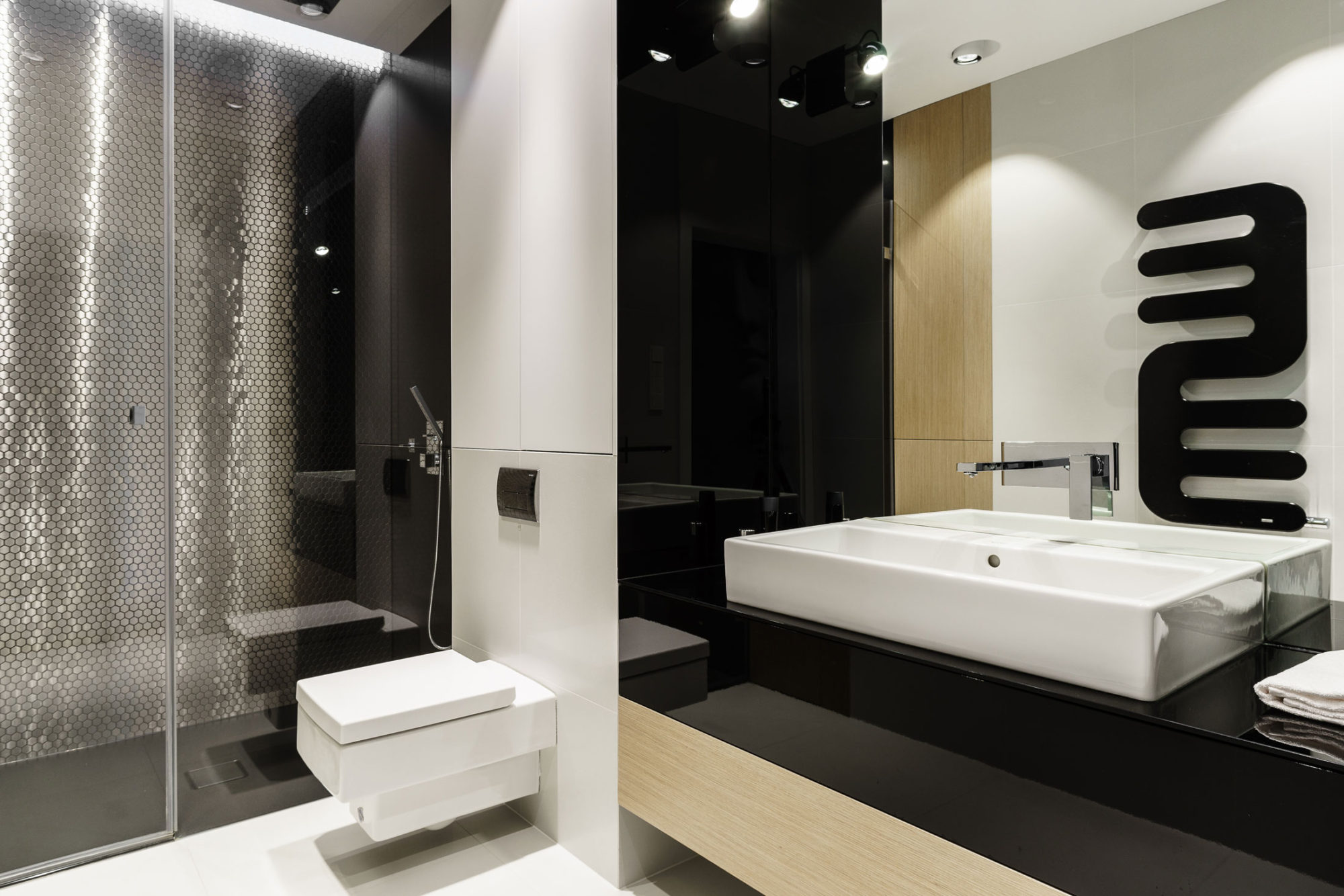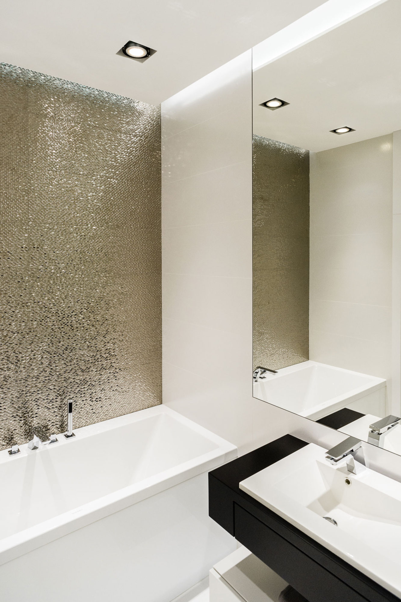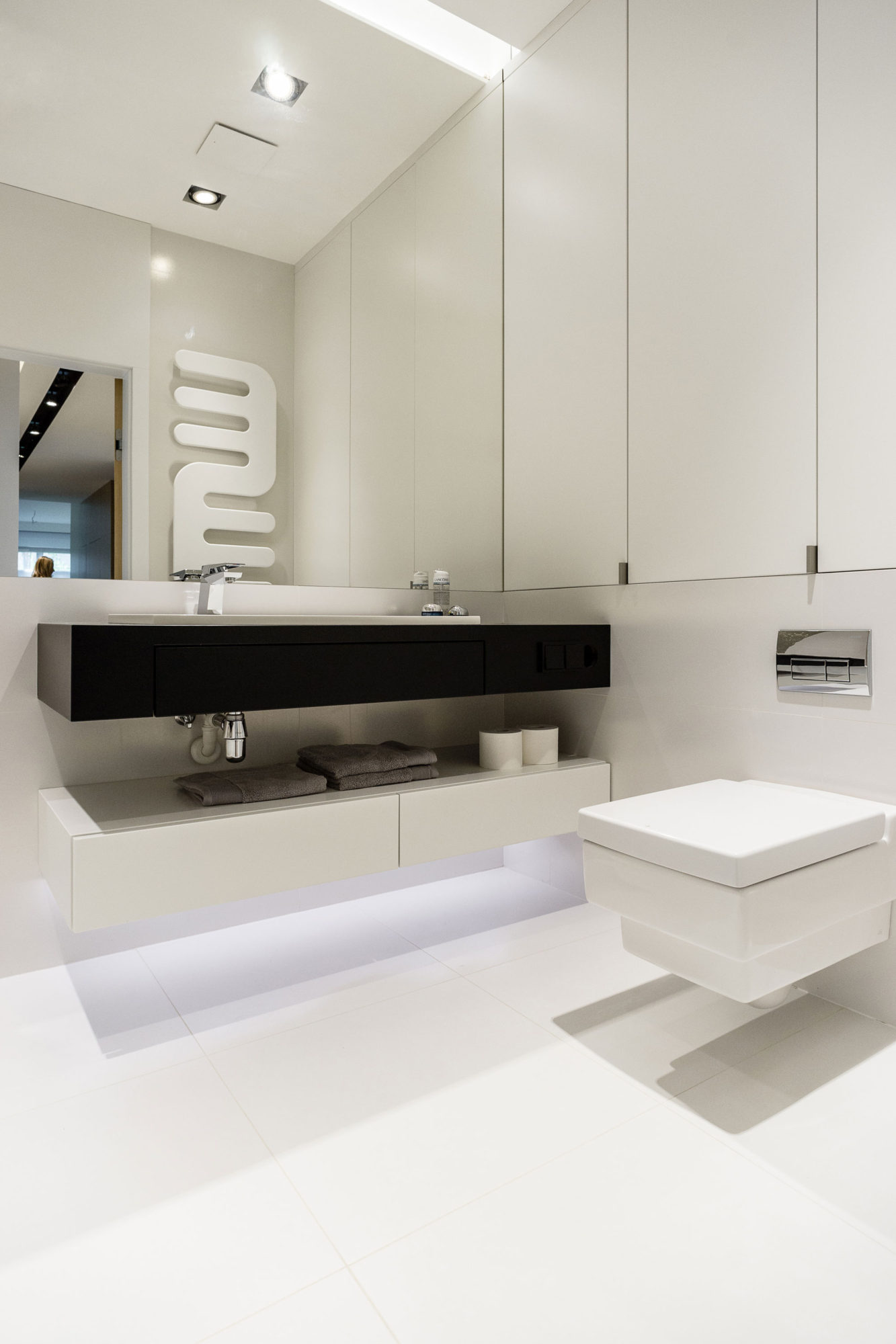 The apartment has been designed with highest care to detail. Apartment was created from two smaller interconnected apartments and has been adapted to the needs of a family of four.The main part of the house is an open space where there is a kitchen, dining area and seating area. In living is a direct exit to the terrace. In the lounge area the unusual Flos lamp and suspended above the sofa unusual bookcase have attracted our attention. A majority of cabinets and closets is hidden behind tall panels or door opening pressure, making it harder to guess where there are lockers.