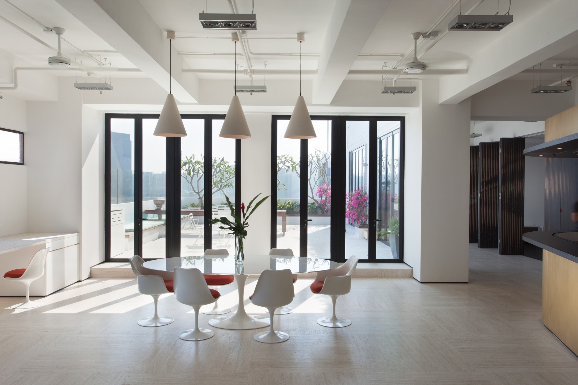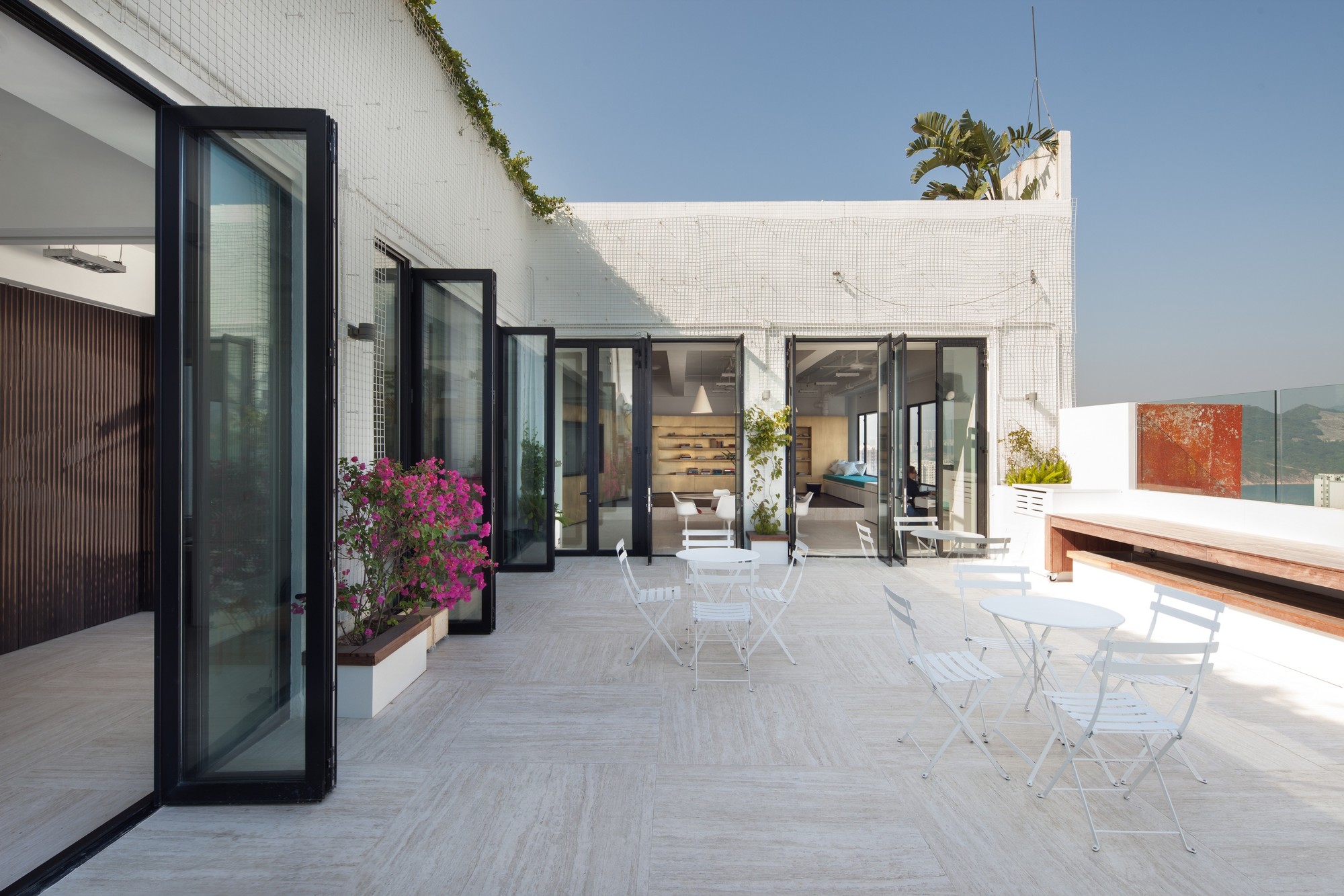 The right wing features something called ArtWall, which measures 32 feet and boasts graphics that honor the dynamic movement of performances. The wooden wall is foldable and acts as a lantern-like divider between a few office spaces and a second performance stage. The third performance stage is encircled by greenery, features gorgeous panoramas of the Chai Wan neighborhood and is located at the rooftop.