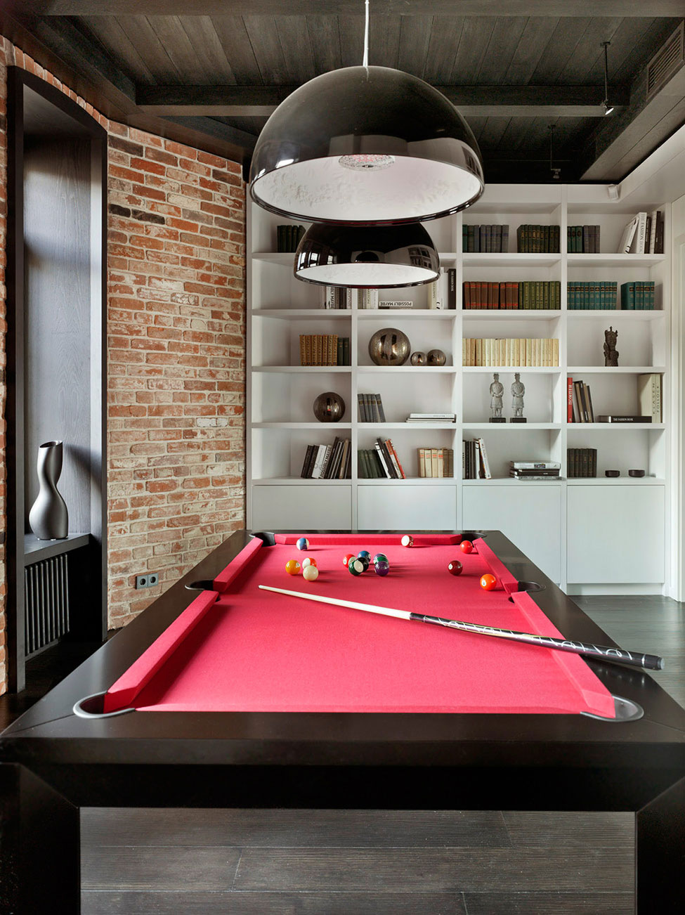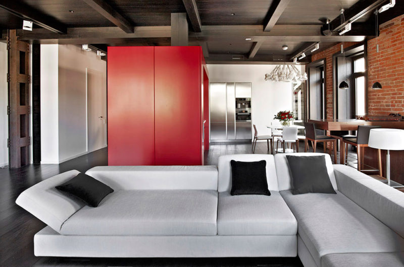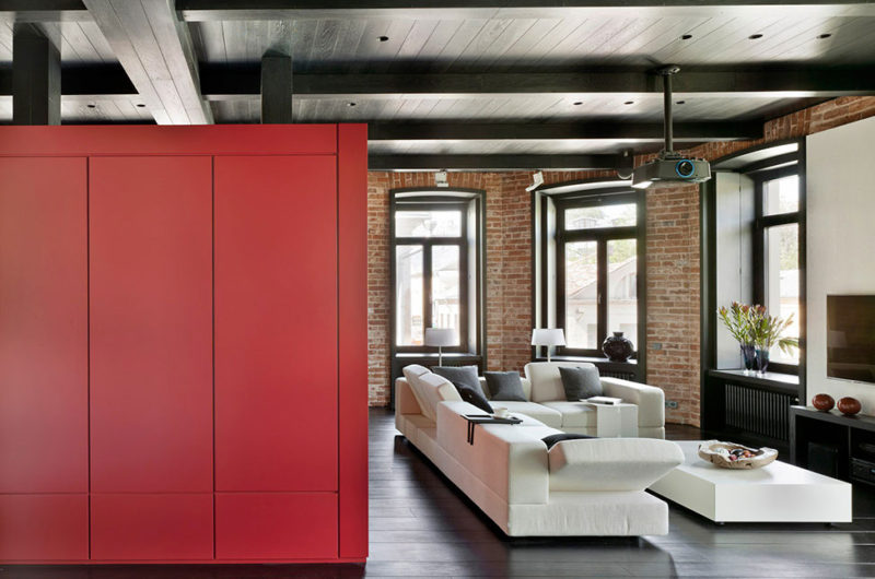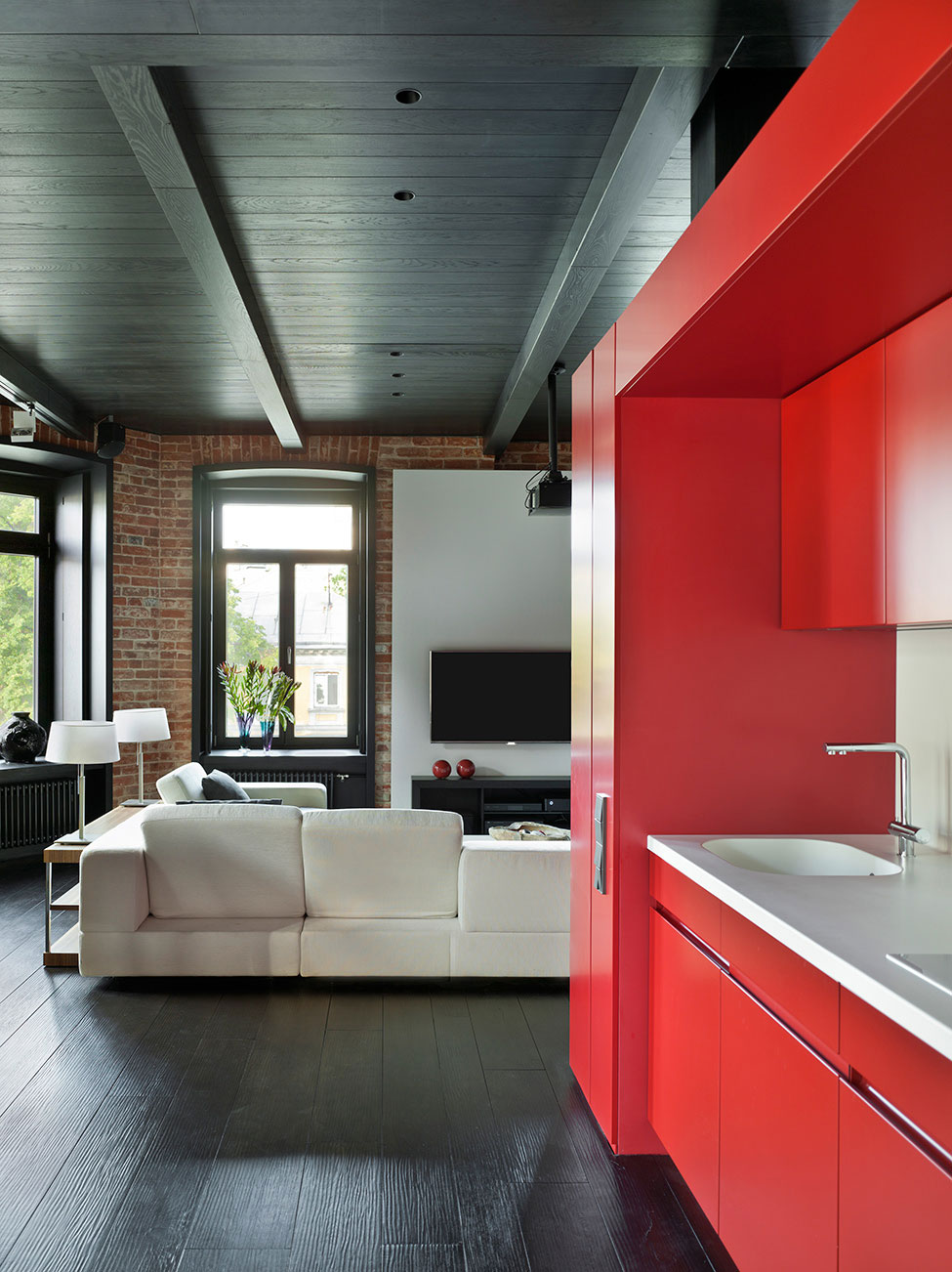 This apartment in Moscow, Russia is an original dwelling that was renovated by the Russian architectural practice of Studioplan. The result is a modern and genuine space emphasized by contrasts and textures mixed with a rustic aspect of exposed ceiling beams and brick walls.