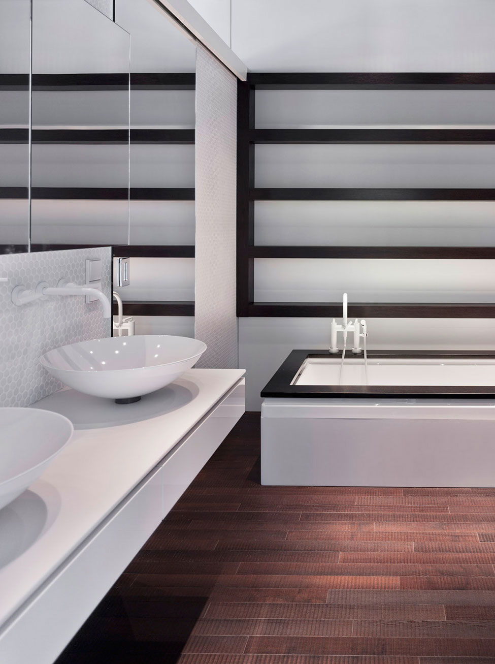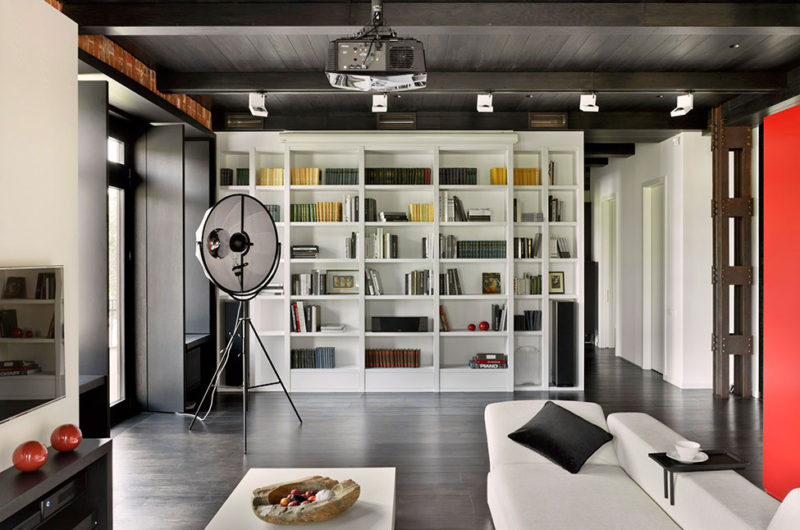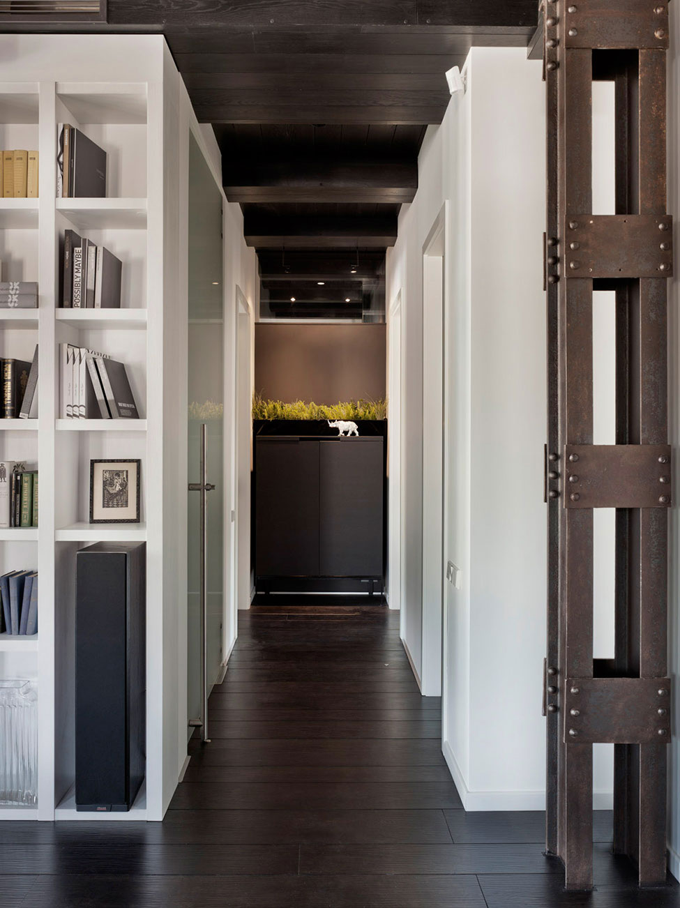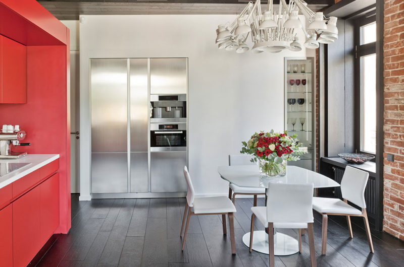 This apartment in Moscow, Russia is an original dwelling that was renovated by the Russian architectural practice of Studioplan. The result is a modern and genuine space emphasized by contrasts and textures mixed with a rustic aspect of exposed ceiling beams and brick walls.