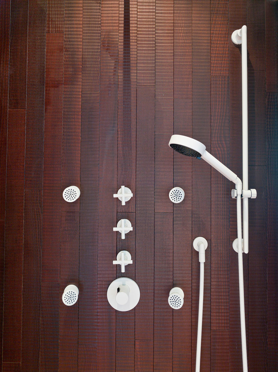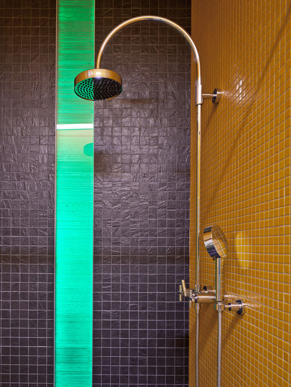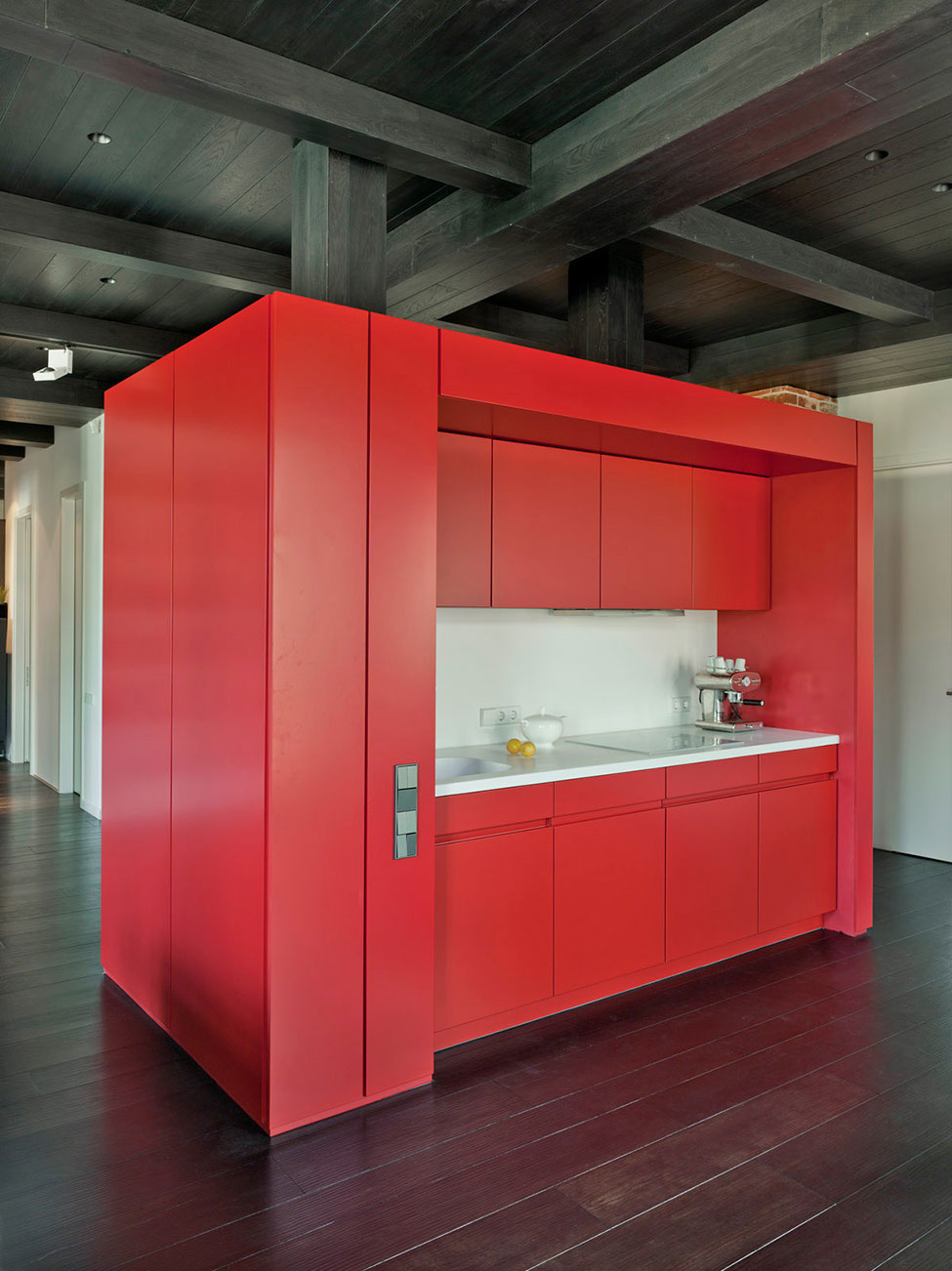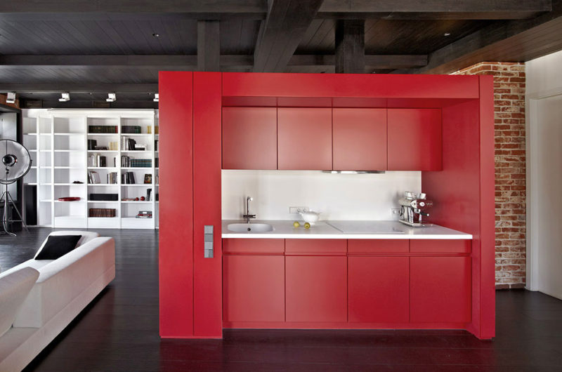 All the attention is concentrated on the kitchen because of its imposing bright red structure. It’s somehow the main attraction of the dwelling, pulling it out of the ordinary, in the same time providing storage space.