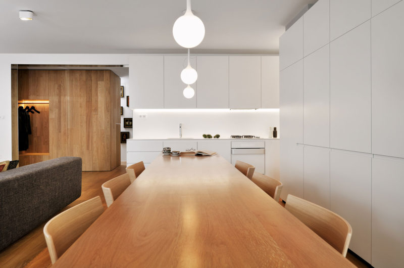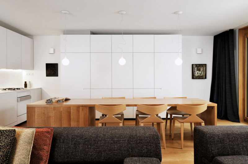 The furniture is pretty simple, following clean and neat lines and combining basic materials with natural colors, in the same time being custom and unique, like for example the big 3.5 m long wooden table in the middle of the dining area.