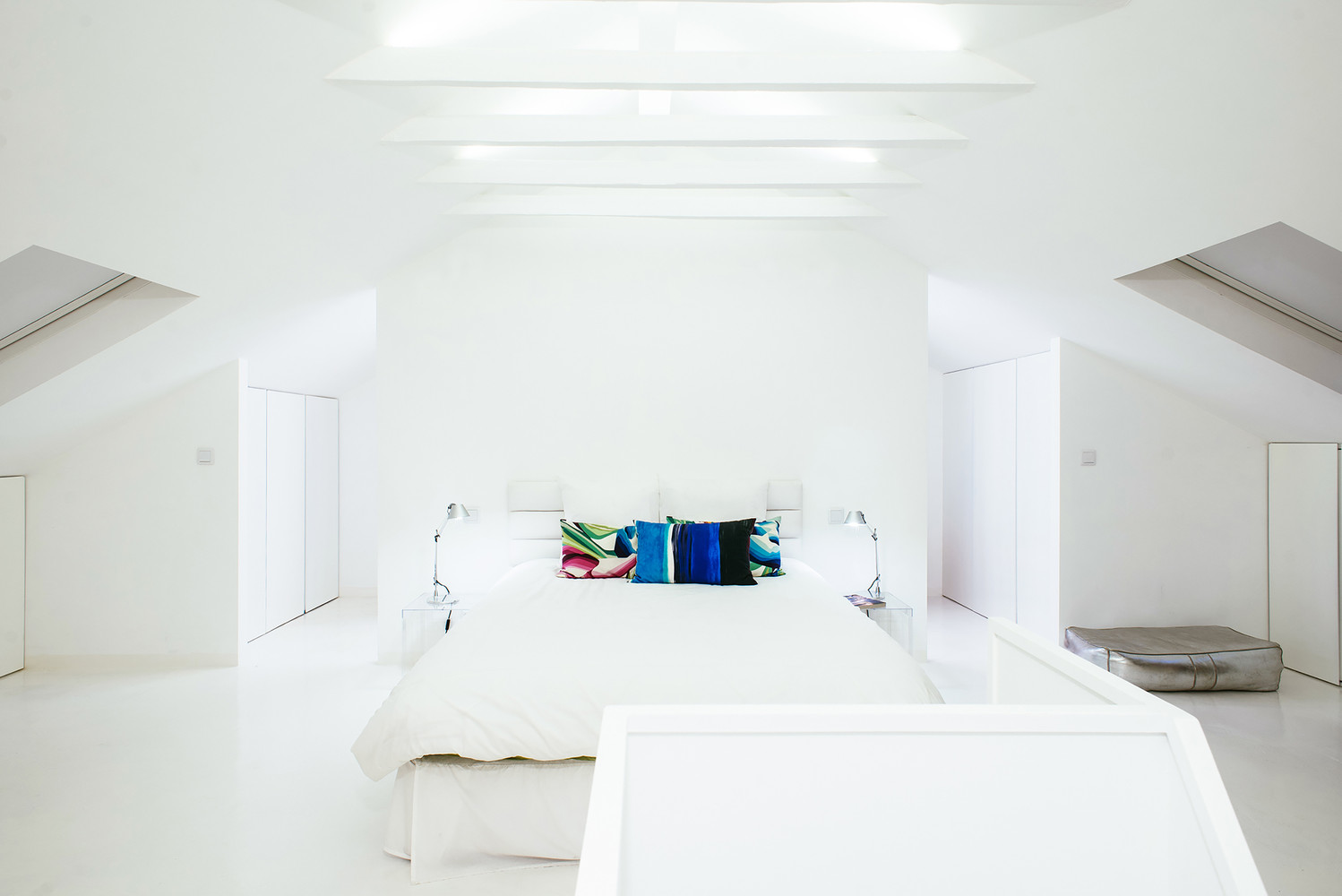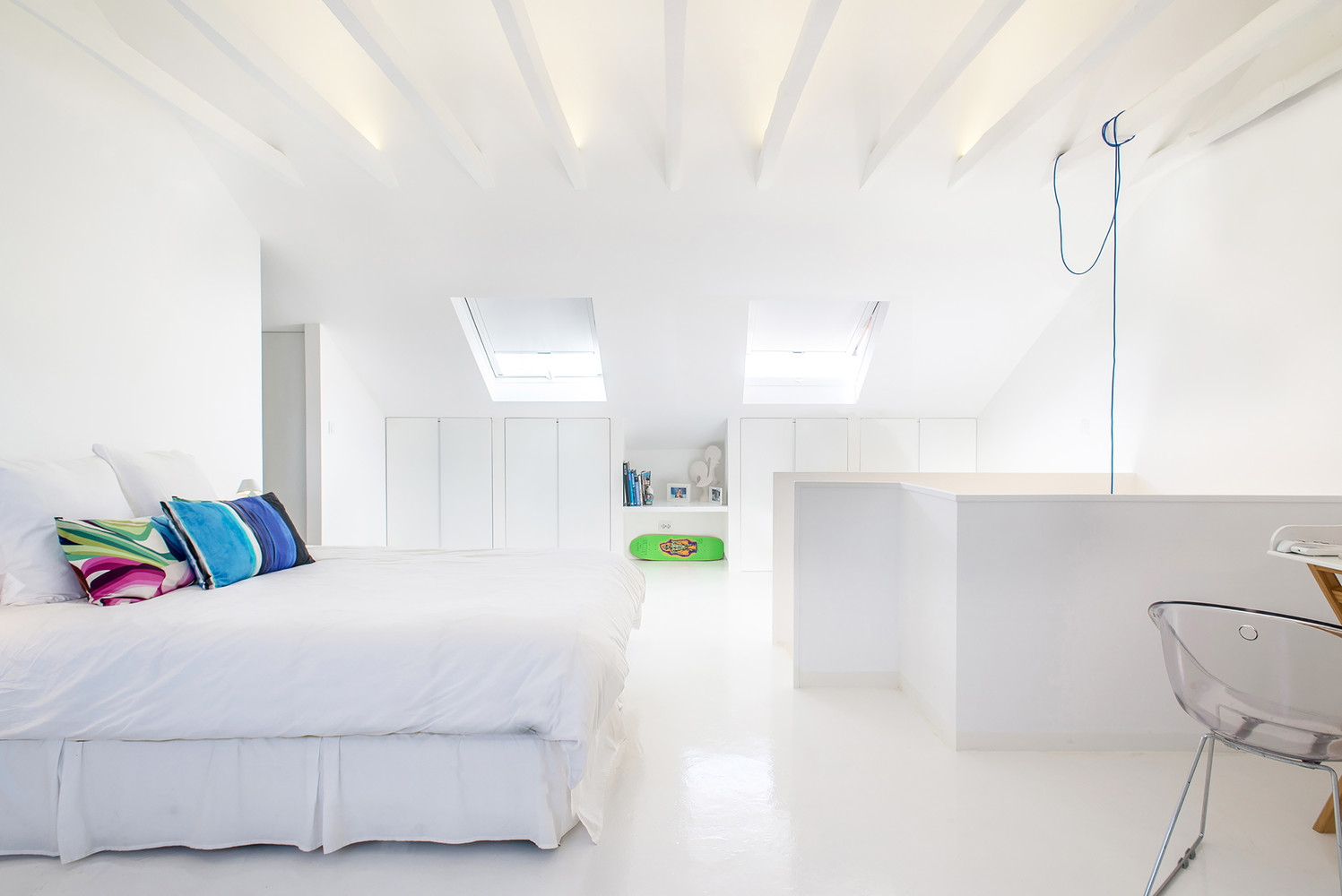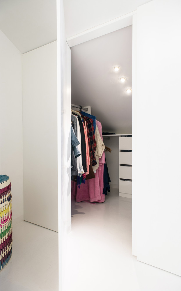 Flaunting two floors, the abode includes a white staircase, white walls, white doors and modern furniture pieces in the same color. The owner requested a special storage area that could be used to house his favorite skateboards, and the architects implemented it along the stairwell. The upper level is flooded with natural light via three skylights, which also ensure great views of Lisbon’s airport and its landing strips.