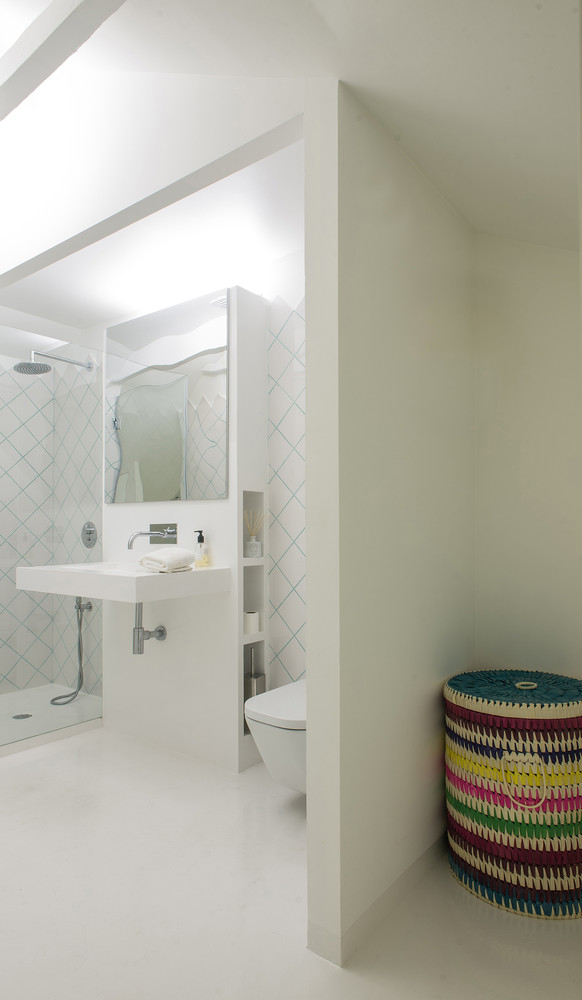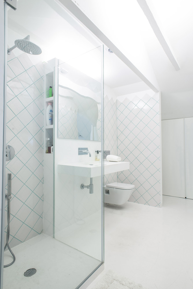 As per request, all of the apartment’s surfaces are crisp white. However, some spaces between the bathroom tiles are mint green for a touch of variety.