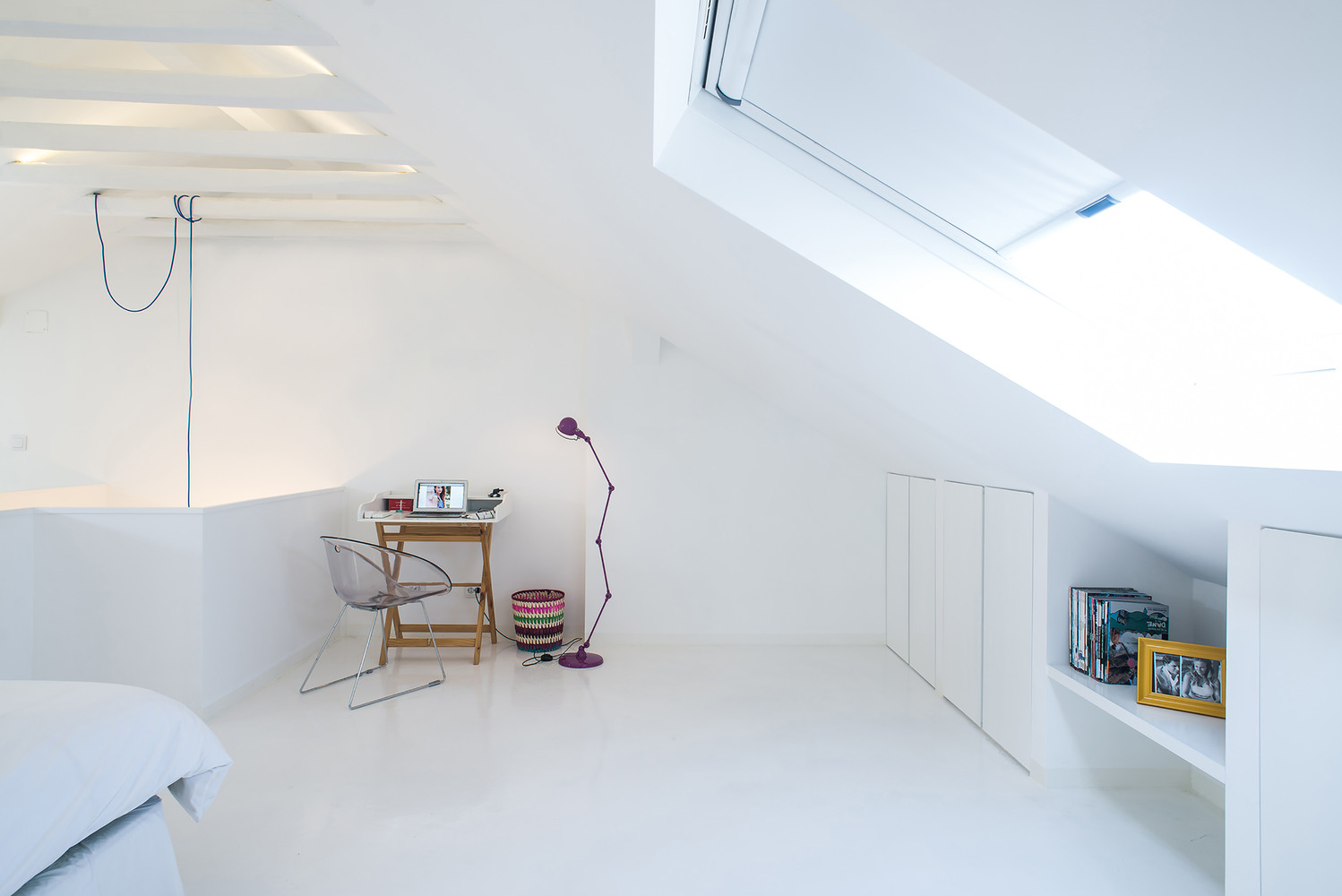 The new ceiling exposes the existing wooden beam structure and three new skylights bring daylight and views to Lisbon´s airport landing strips. Him being a flight attend, these new openings play a huge backdrop scenario where he is able to control his working schedule.