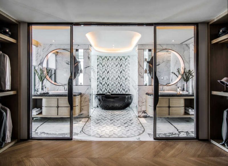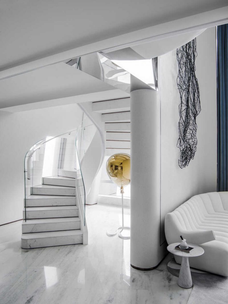 Model duplex, designed by T.K. Chu Design stretches up to 700 m2 in the Marina Centre of Zhuhai City, China. The stunning ocean view serves as an inspiration for the exterior and interior design. The curved laps with blue and white colour palette mimic the traditional sea waves. This modern duplex adorns high-class furniture pieces from luxury brands like Bentley, Roche Bobois, Cappellini, Cornelio, and Galotii & Radice. It looks modern, minimal, and multi-cultural, all at the same time.