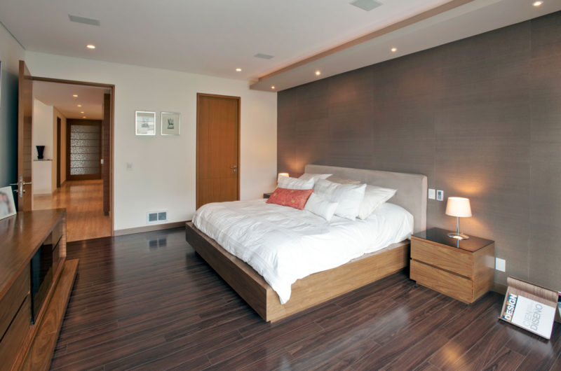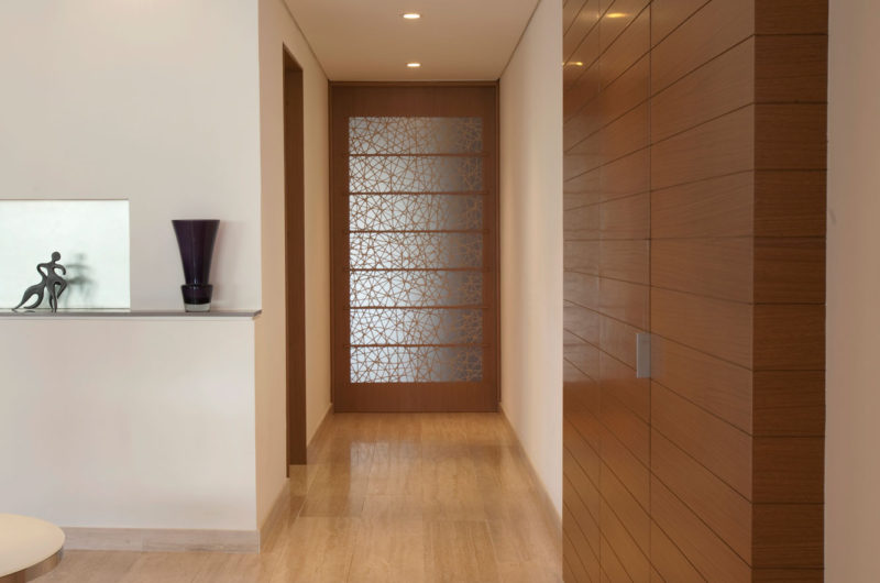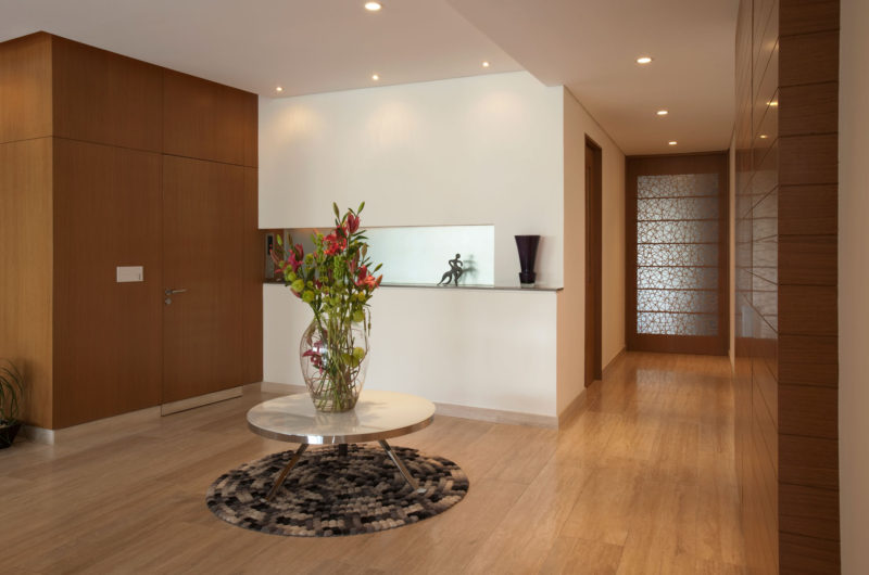Access to the contemporary Armoni Apartment is ensured by an elevator which is wrapped in a wooden box. The elevator is situated in the center of the house, with the family room, kitchen, and secondary bedrooms being located on the left, and the main bedroom and public areas being housed on the opposite side.