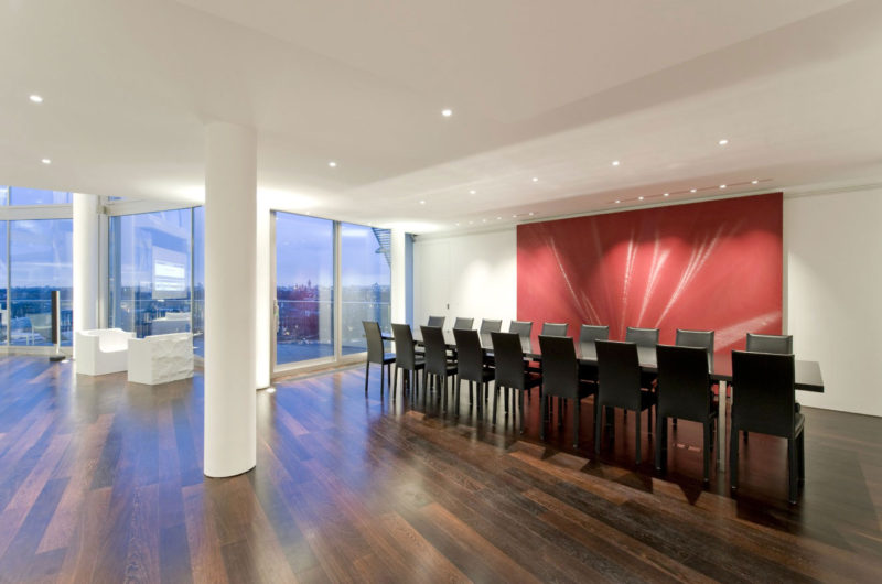 Richard Meier designed the Riverside Penthouse overlooking the River Thames, located in London, UK. This extraordinary apartment offers incredible views over the British Capital and features spacious rooms painted in neutral colors.