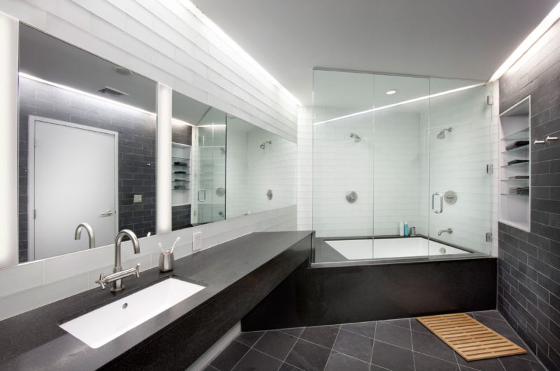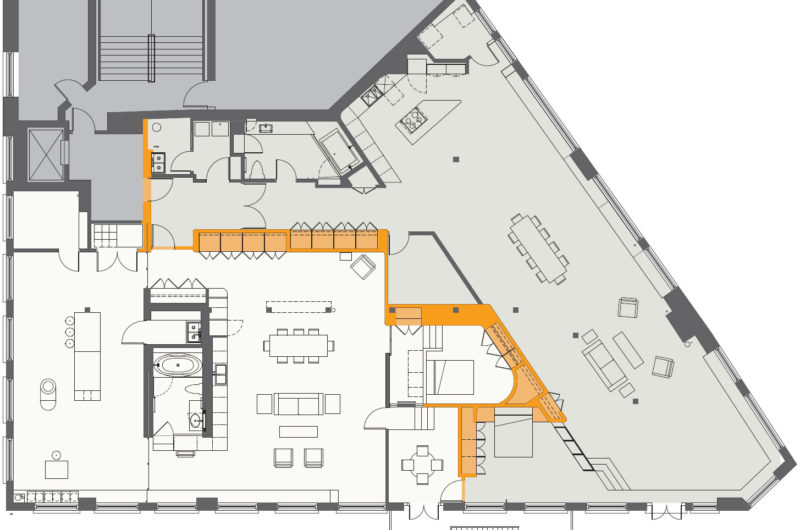 Then, the stake was on the casework and detailing because while his casework was designed as stacked volumes which can be modified from closed cabinets to open shelves, her casework is more abstract with glass doors and a more monolithic expression.