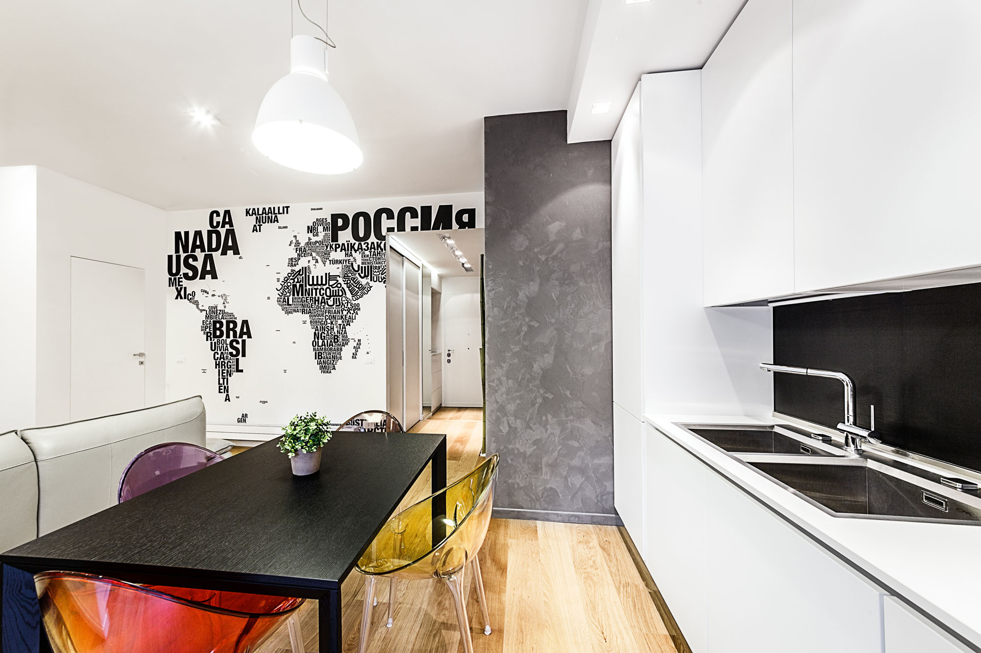 The feeling of being immersed in a bamboo forest is amplified by the optical effect created by the large mirror at full-height. The open floor plan is cozy, colorful and features a texture, black on white, that in drawing the world nominates countries in the different languages.