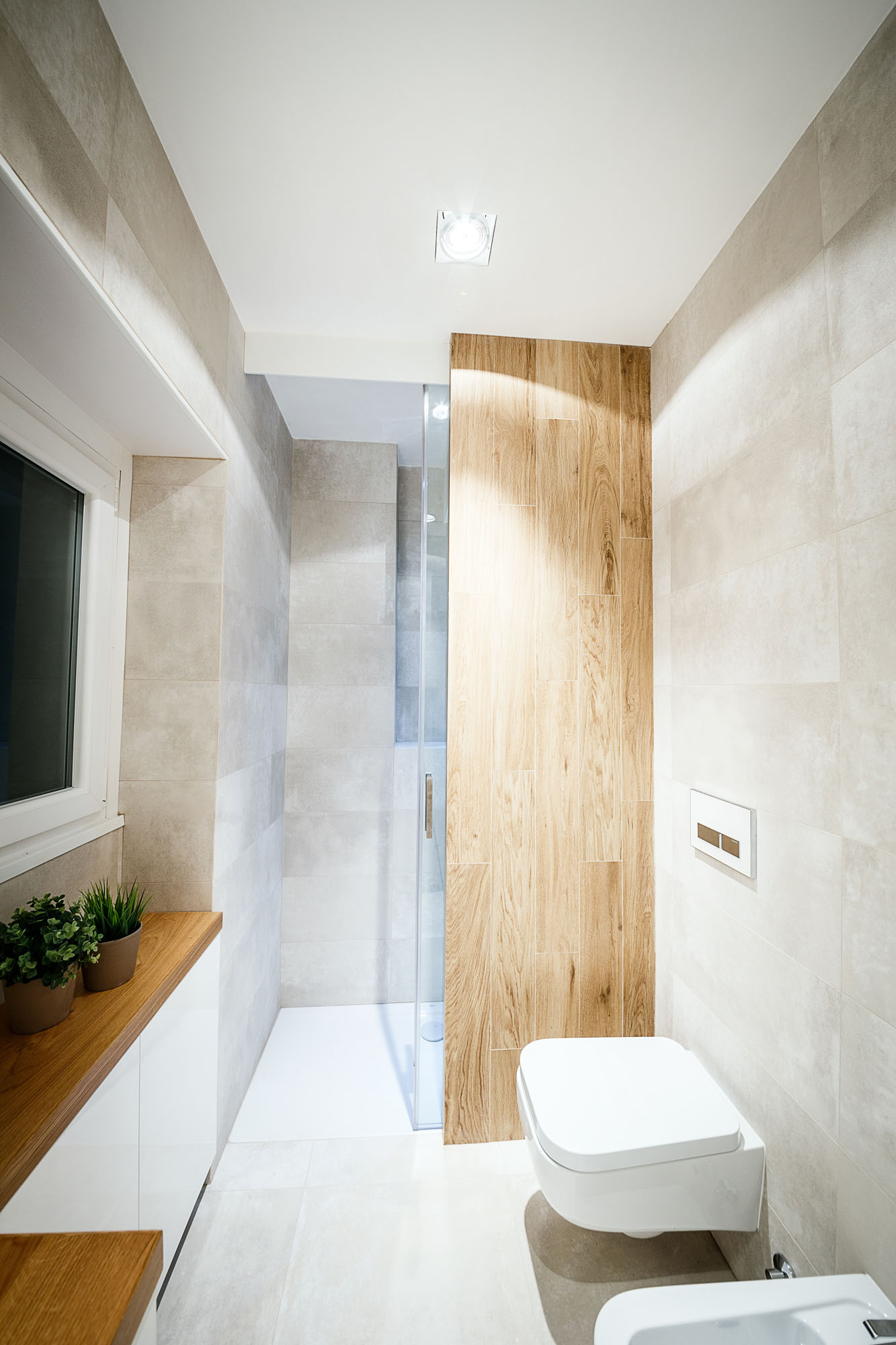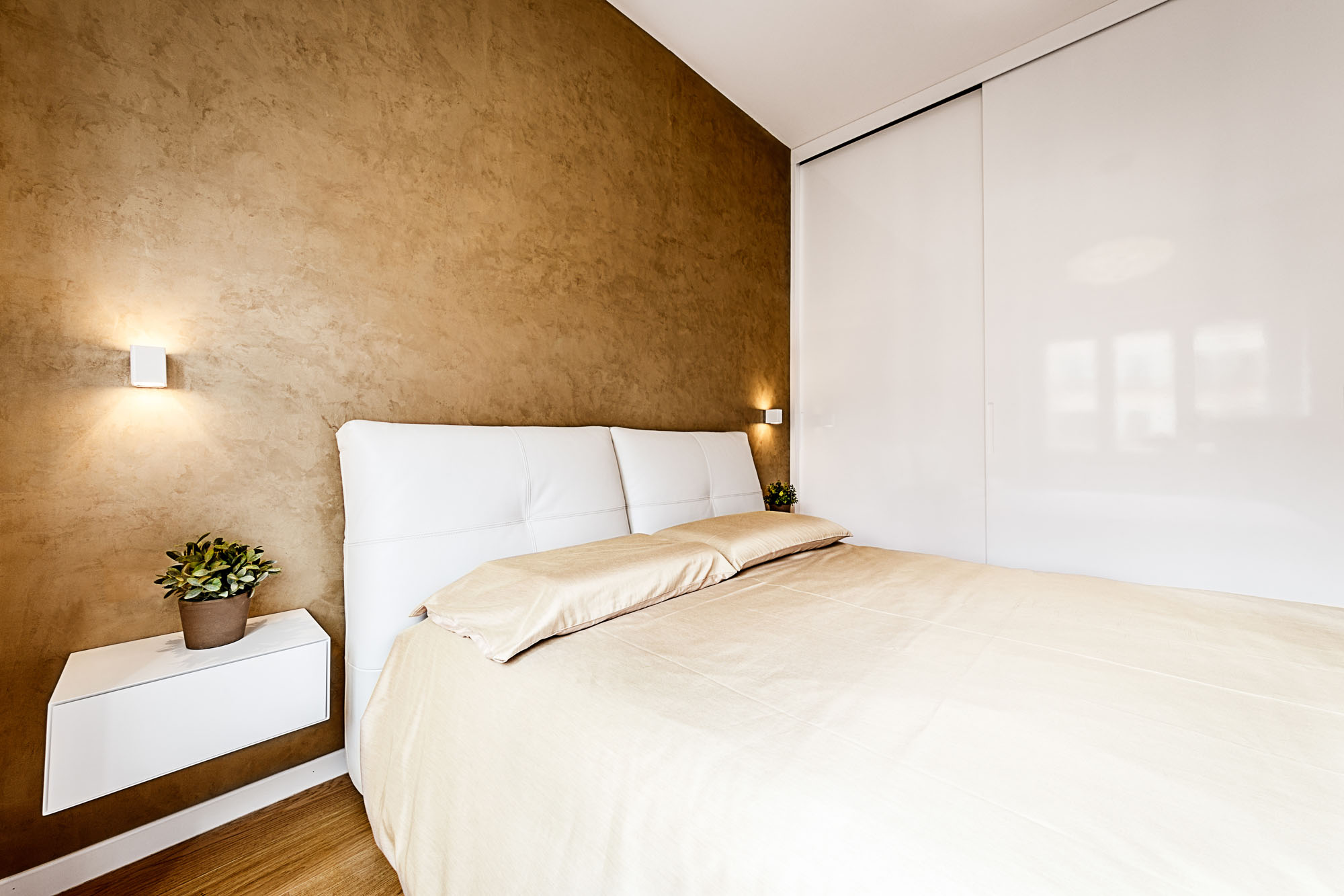 Concealed furniture and invisible doors introduce to the other rooms of the house, carefully designed with elegance. The bedroom is made precious by a bright golden wall, emphasized by the grazing light of the two wall sconces. Bathrooms have solutions for comfort and sensorial harmony, through natural materials and plays of transparencies, which are essential for the physical and psychological wellbeing.